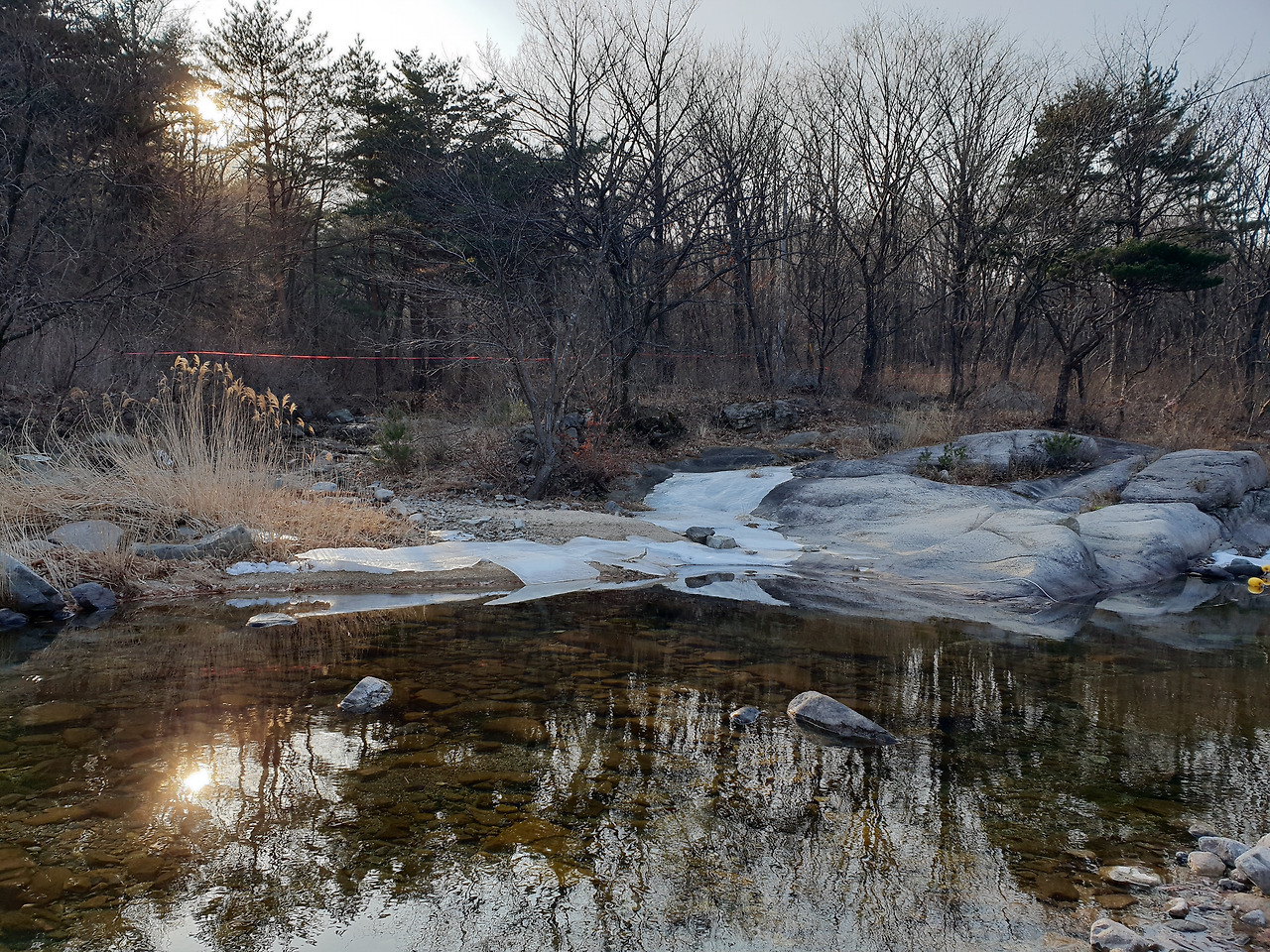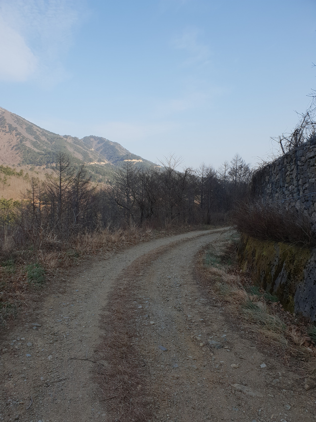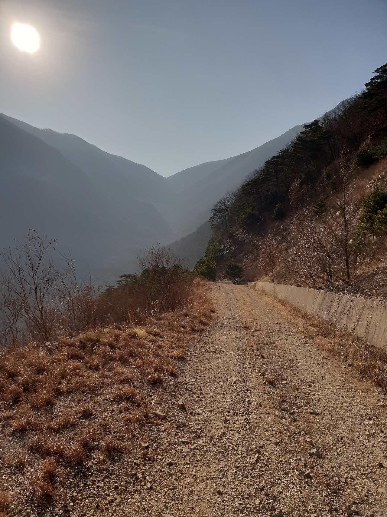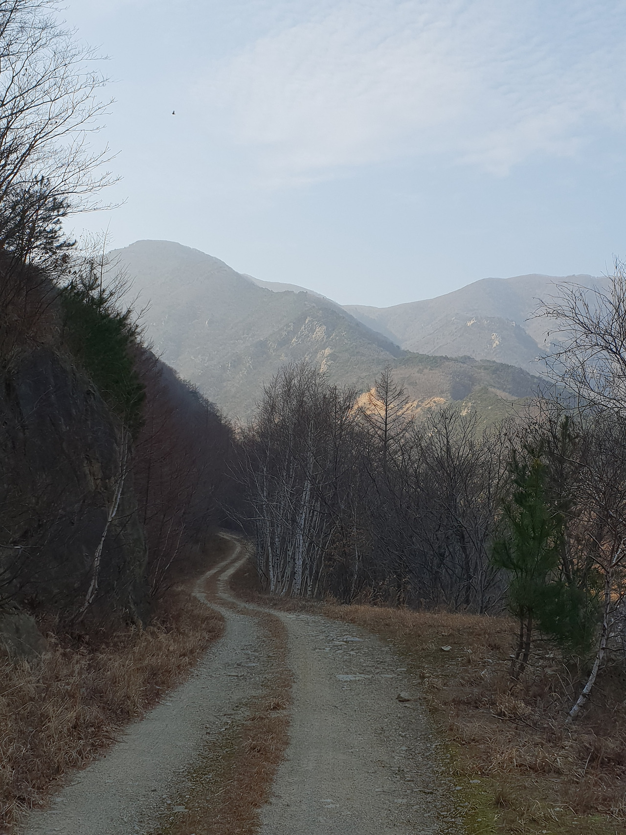 임도 들머리부터 우거진 숲으로 마음이 편해진다. 개인 사유지를 살짝 지나면 본격적 임도가 시작된다. 두 번째 안내판이 있는 삼거리까지 편히 오른다. 여기서 왼편으로 다리를 건너면 새이령 방향, 오른쪽으로 가면 원터와 굴바위 쉼터를 지나 새이령이 나온다고 쓰여있다. 오른편 원터를 지나 새이령을 오르려 길을 정했지만 조금 가니 풀이 우거져 더 이상 진행할 수 없다. 산책하시는 동네 어르신께 여쭤보니 원래 삼거리 주변에 작은 마을이 있었지만 지금은 다 떠나서 길도 없어졌다고 한다. 누군가의 삶의 터전이 시간의 흐름 속에서 사라지고 이제는 남은 흔적들이 과거를 가늠케 한다. 인생의 허무함이 이 계절만큼이나 스산함을 준다.