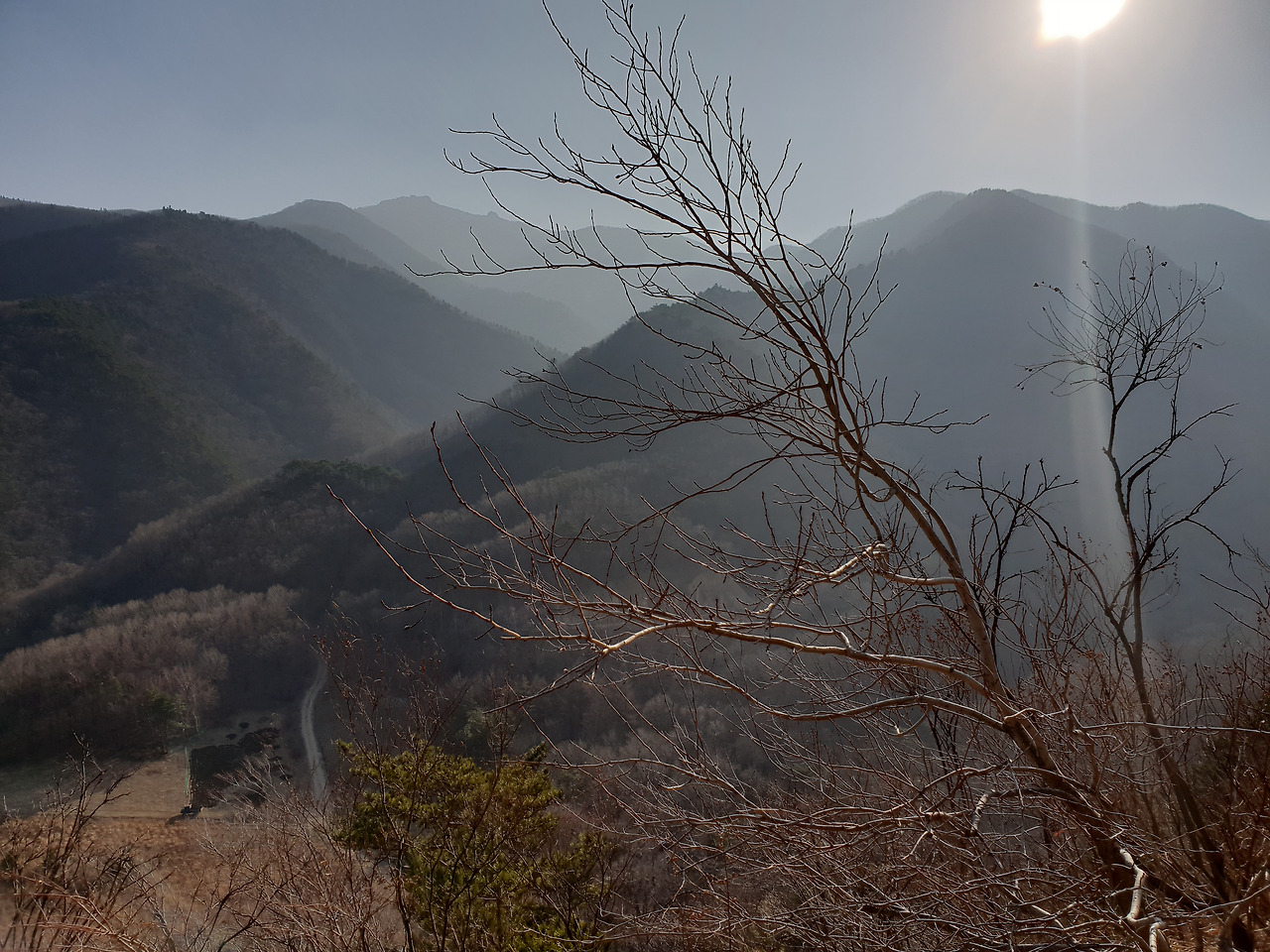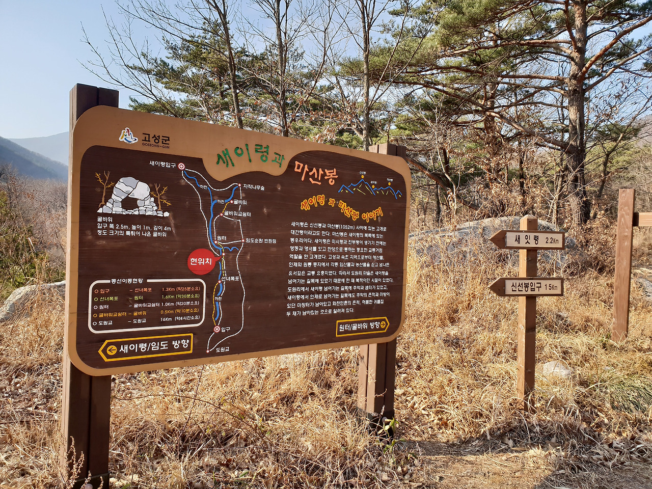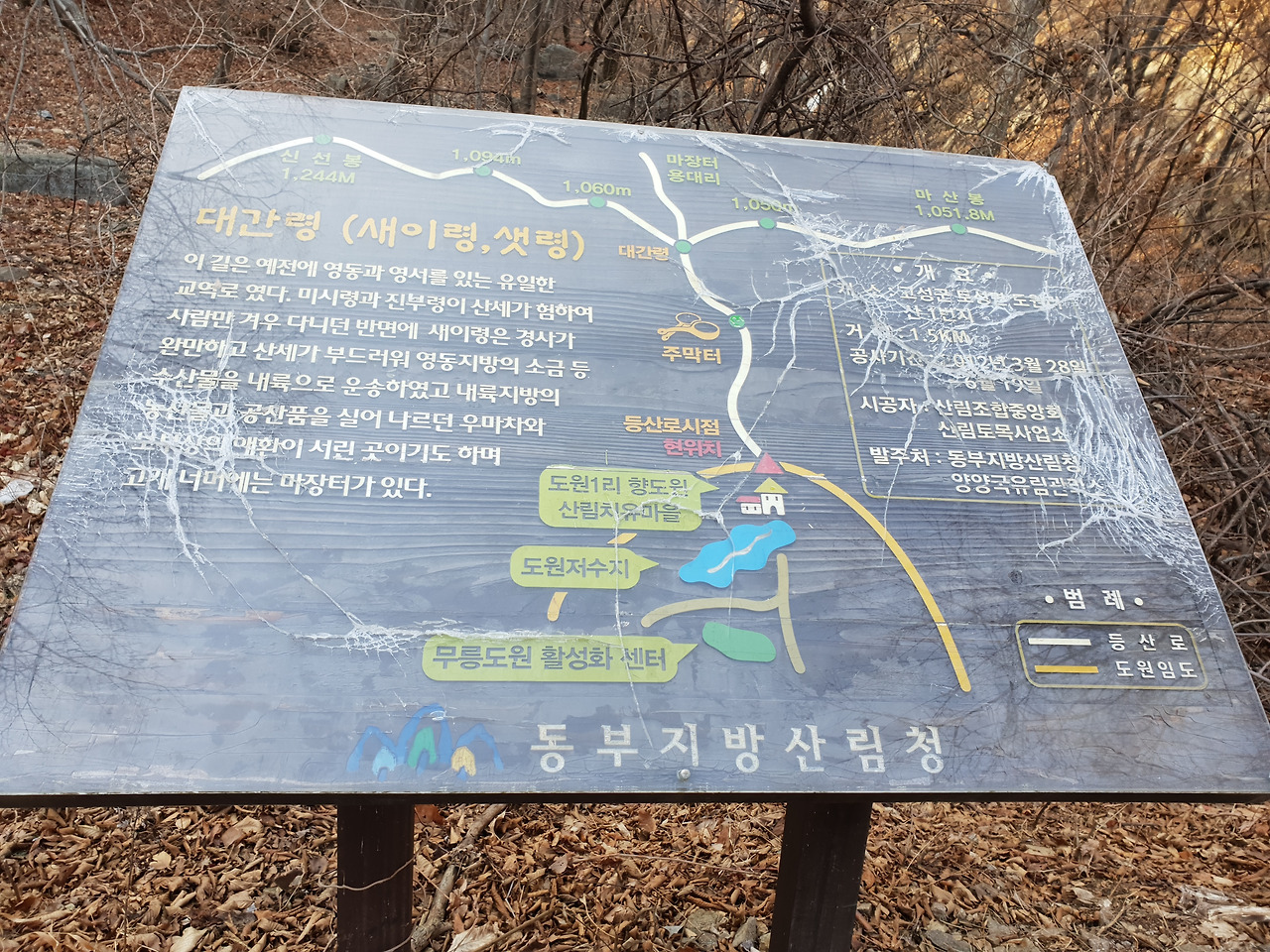 경사가 급한 헤어핀을 오르니 세 번째 안내판이 있다. 새이령이 지척이다. 대간령으로 불리기도 했던 이 고개는 진부령 미시령과 같이 동서를 연결하는 중요한 교통거점이었다. 진부령 미시령과 달리 산세가 높지 않아 물자의 왕래가 많았다고 전해진다. 그때 오고 가는 이들이 이용한 주막과 마방이 있었던 마장터, 화전민의 흔적이 이곳 도원리에 아직 남아있다. 대간령을 지나 달리다 보니 이 길은 아까 아래서 올려다본 산 중턱의 그 길. '혹시나~'가 현실이 되었다. 이곳은 마산봉이고 해발 1051m이다. 여기부터는 양지라 햇볕도 좋고 뷰도 좋다. 따뜻한 햇살 아래서 준비해 온 도시락을 맛있게 먹었다.