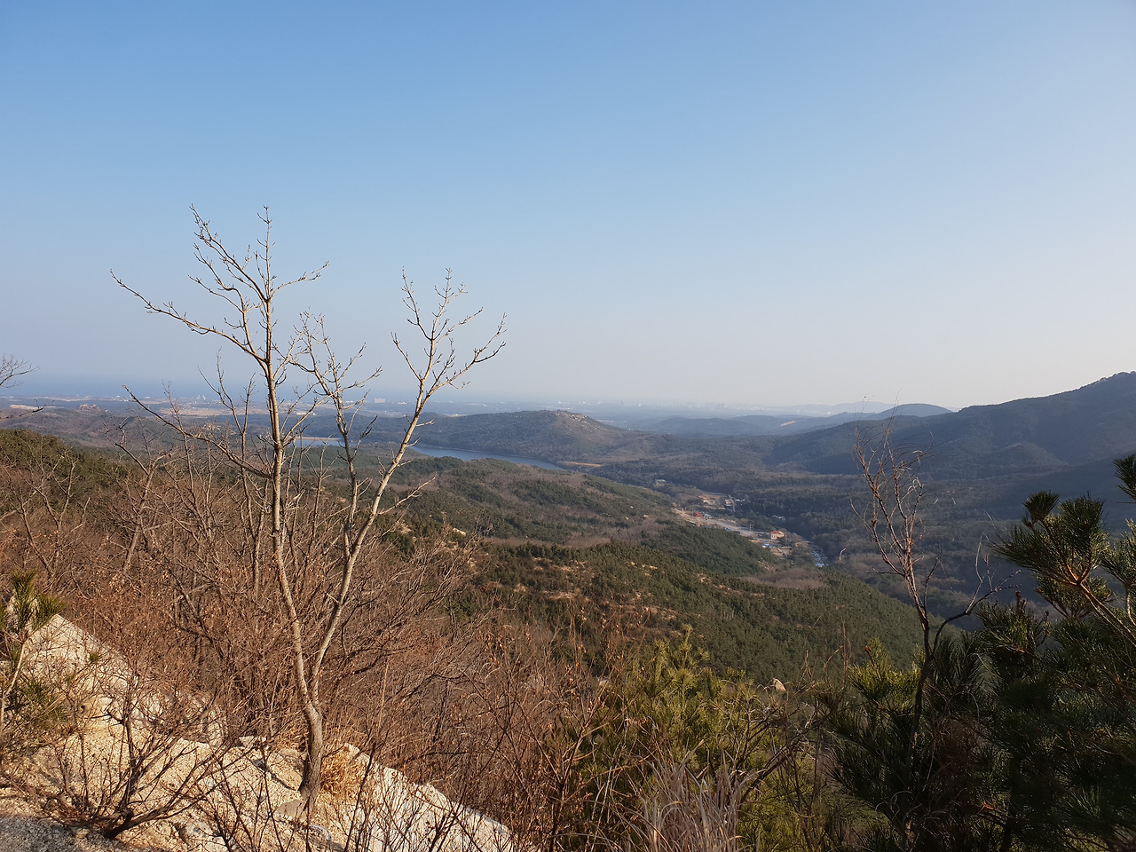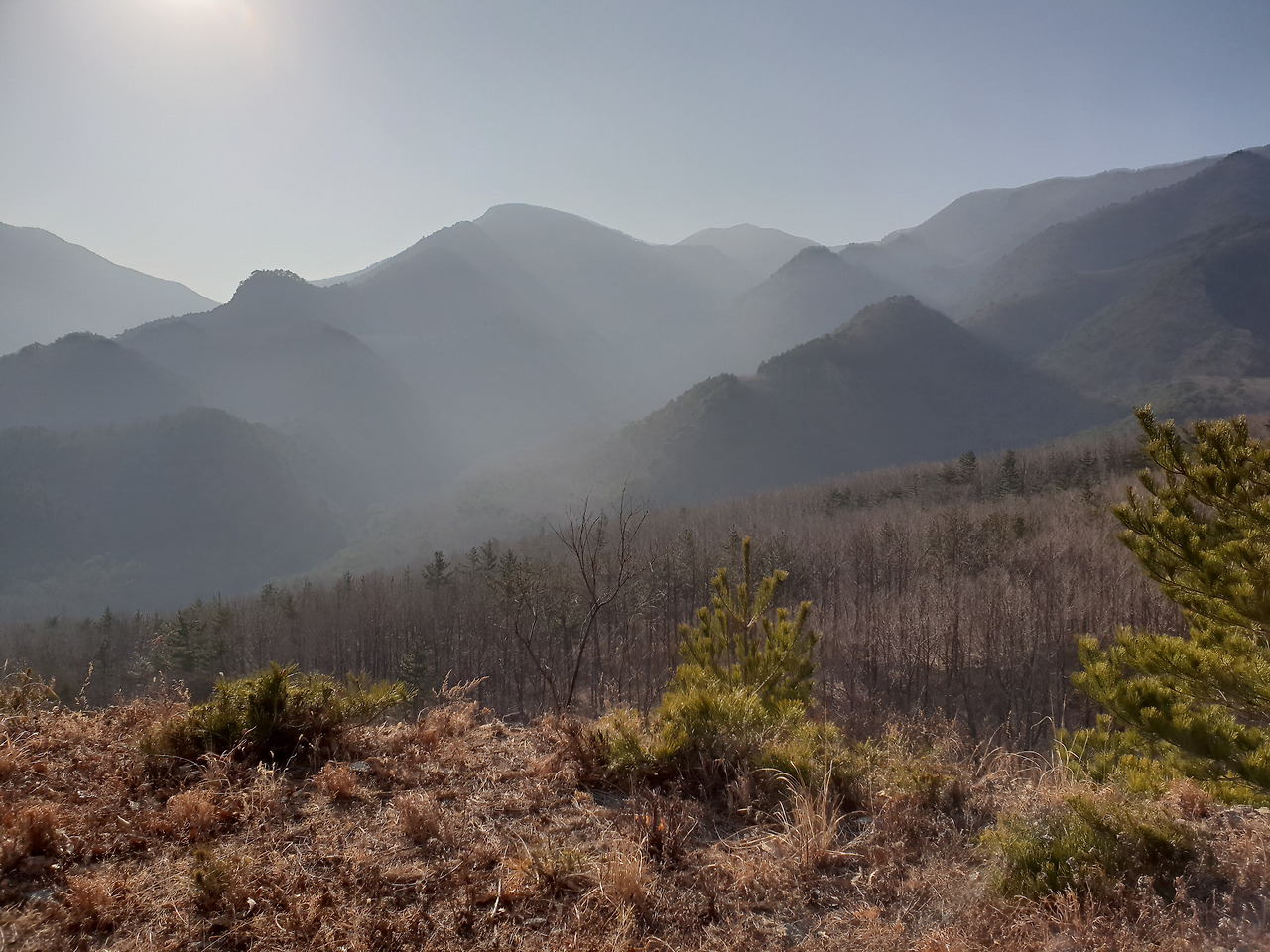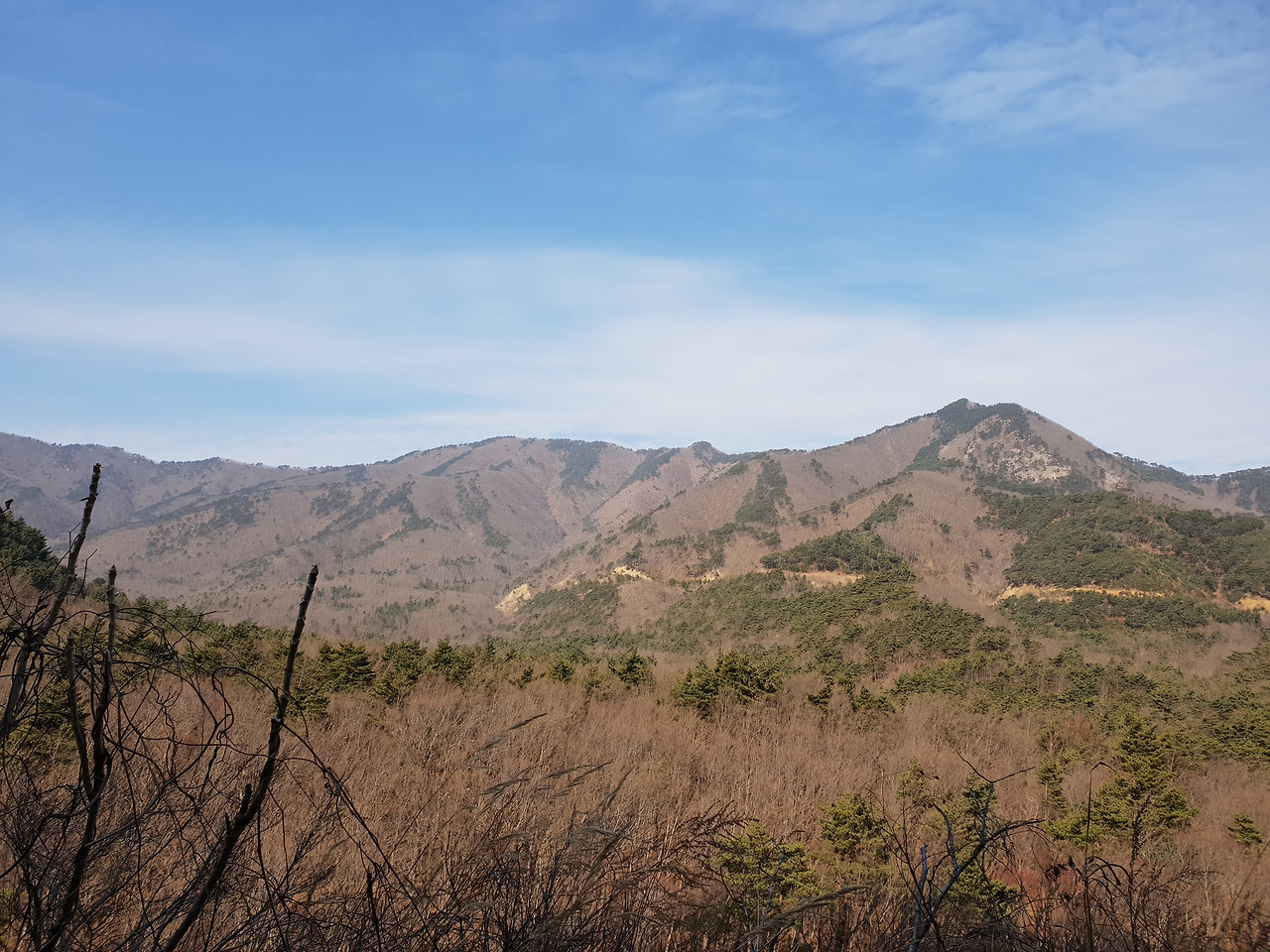 경사가 급한 헤어핀을 오르니 세 번째 안내판이 있다. 새이령이 지척이다. 대간령으로 불리기도 했던 이 고개는 진부령 미시령과 같이 동서를 연결하는 중요한 교통거점이었다. 진부령 미시령과 달리 산세가 높지 않아 물자의 왕래가 많았다고 전해진다. 그때 오고 가는 이들이 이용한 주막과 마방이 있었던 마장터, 화전민의 흔적이 이곳 도원리에 아직 남아있다. 대간령을 지나 달리다 보니 이 길은 아까 아래서 올려다본 산 중턱의 그 길. '혹시나~'가 현실이 되었다. 이곳은 마산봉이고 해발 1051m이다. 여기부터는 양지라 햇볕도 좋고 뷰도 좋다. 따뜻한 햇살 아래서 준비해 온 도시락을 맛있게 먹었다.