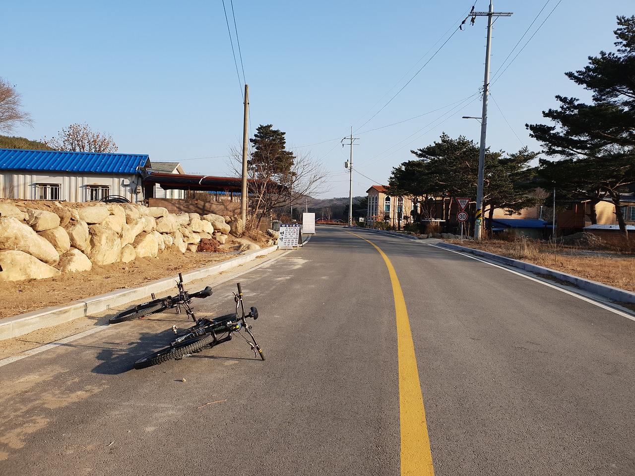 맛있는 점심식사 후 구비구비 산을 돈다. 저 멀리 앞산 중턱에도 임도길이 보인다. 저 길도 지나나 보다. 이미 산에 올랐으므로 심한 업다운은 없다. 즐겁게 달리다 보니 벌써 오후 2시, 겨울산은 해가 일찍 진다. 게다가 초행길이라 마음이 급해진다. 3시까지는 라이딩을 끝내야 하는데 더 이상 안내판이 없으니 남은 거리를 가늠할 수 없다. 쉬지 않고 한참을 달렸다. 저 멀리 산 아래 저수지와 휴양지 주차장이 보인다. 마음이 놓인다. 다운이 시작된다. 잔돌들이 많지만 험한 길은 아니다. 다 내려오니 도원리 버스정류소 옆이다. 시간도 잘 맞췄고 길도 좋았다. 새롭게 발견한 좋은 임도길이었다.