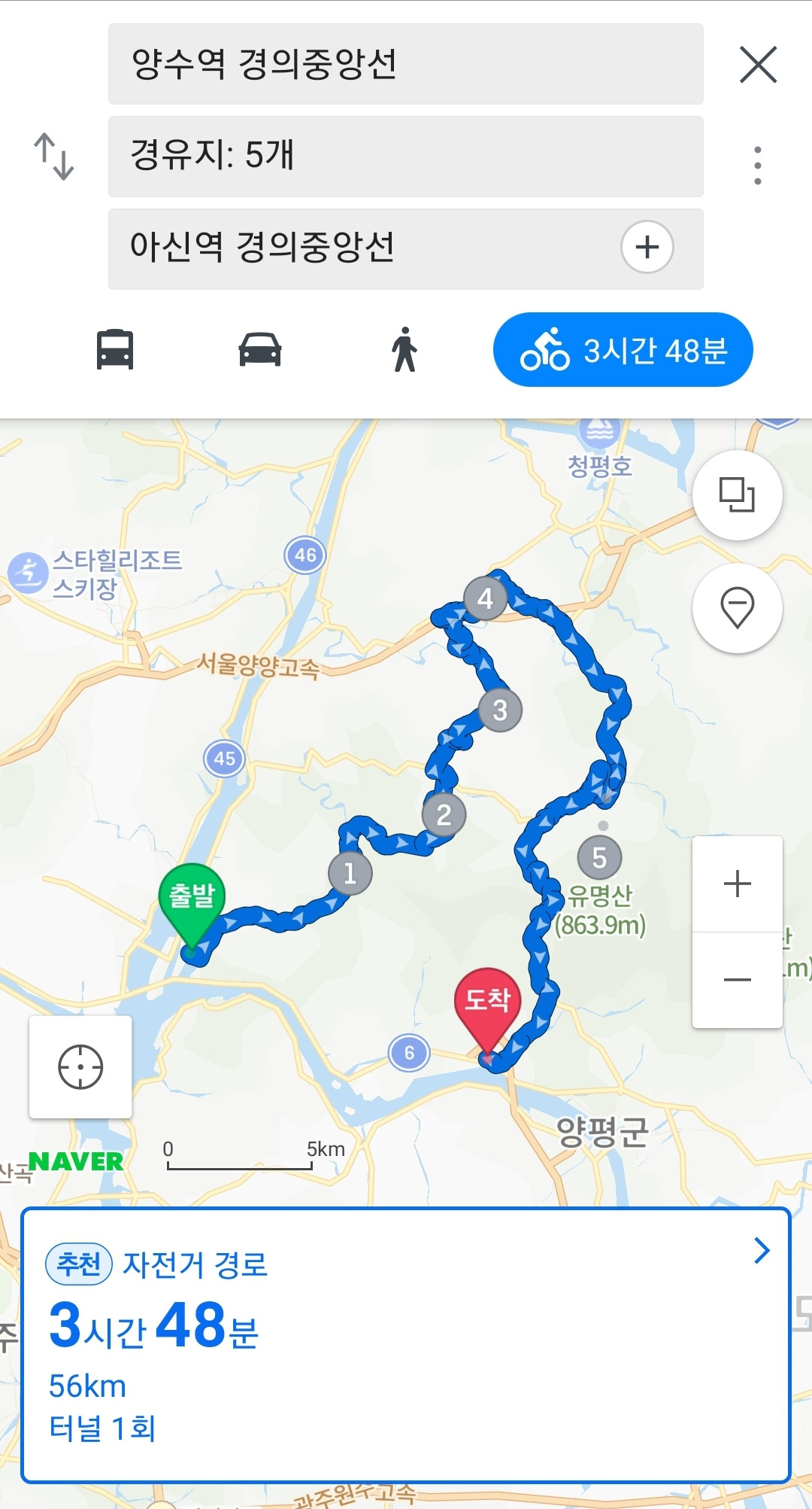 양수역에서 시작해 벗고개- 서후고개- 명달리 - 서후고개-벗고개 순서로 다시 양수역에 도착하는 5고개도 재밌다. 명달리는 중미산 정도의 길이와 경사도이다. 그리 힘들진 않지만 앞선 두 고개를 오른 피로감에 녹녹하진 않다. 그래도 5고개 중에선 가장 뷰가 좋아 오르는 재미가 있고 포토존인 멋진 헤어핀도 있다. 서후고개나 벗고개 리버스는 반대편보다 더 긴 길이로 만만치 않다. 특히 서후고개 리버스는 반대편보다 꽤 길다. 그래도 다 오르고 나면 양수역으로 갈 수 있으므로 자전거길을 통해 가는 번거로움이 없어 아주 좋은 코스이다.
