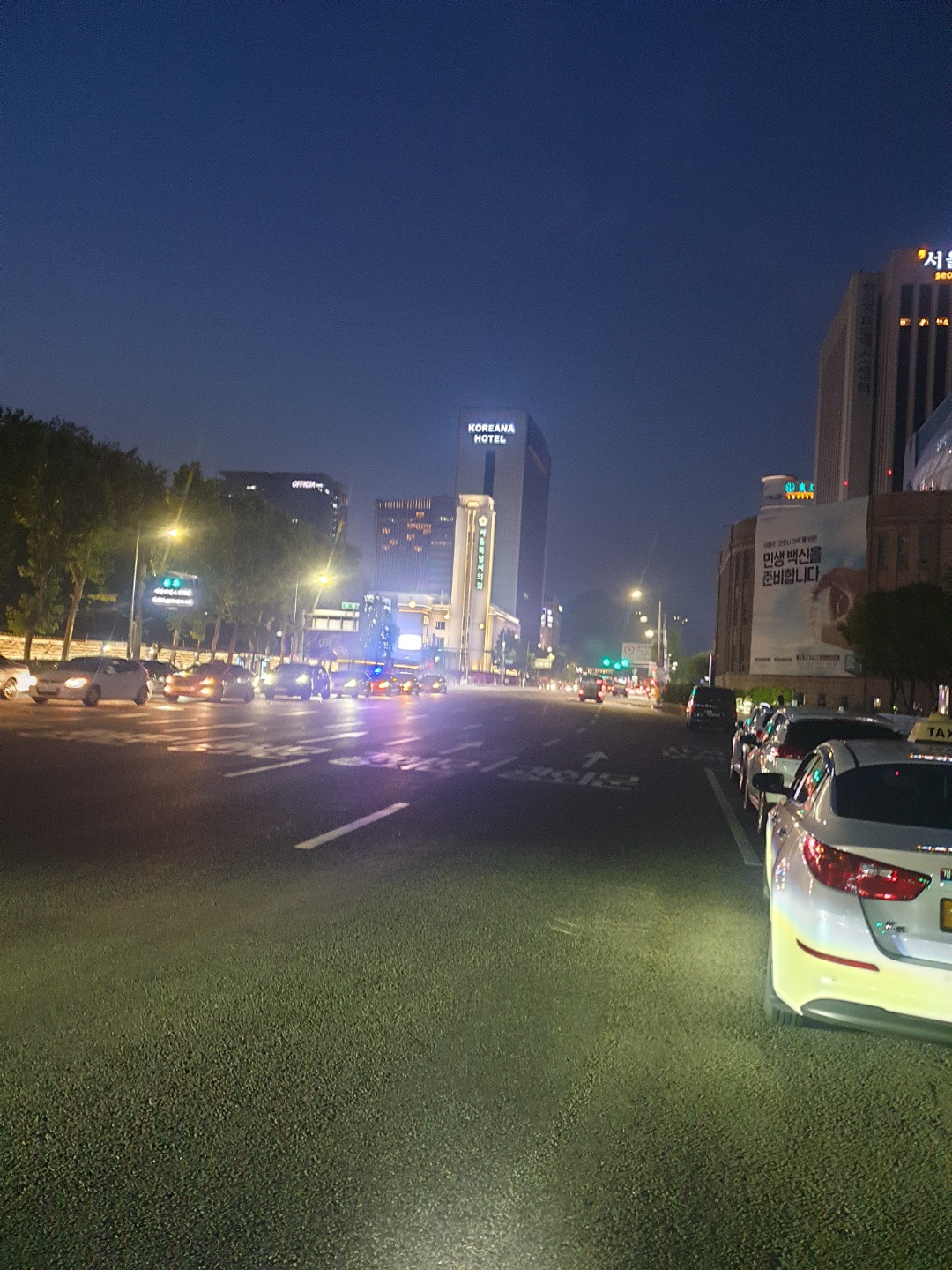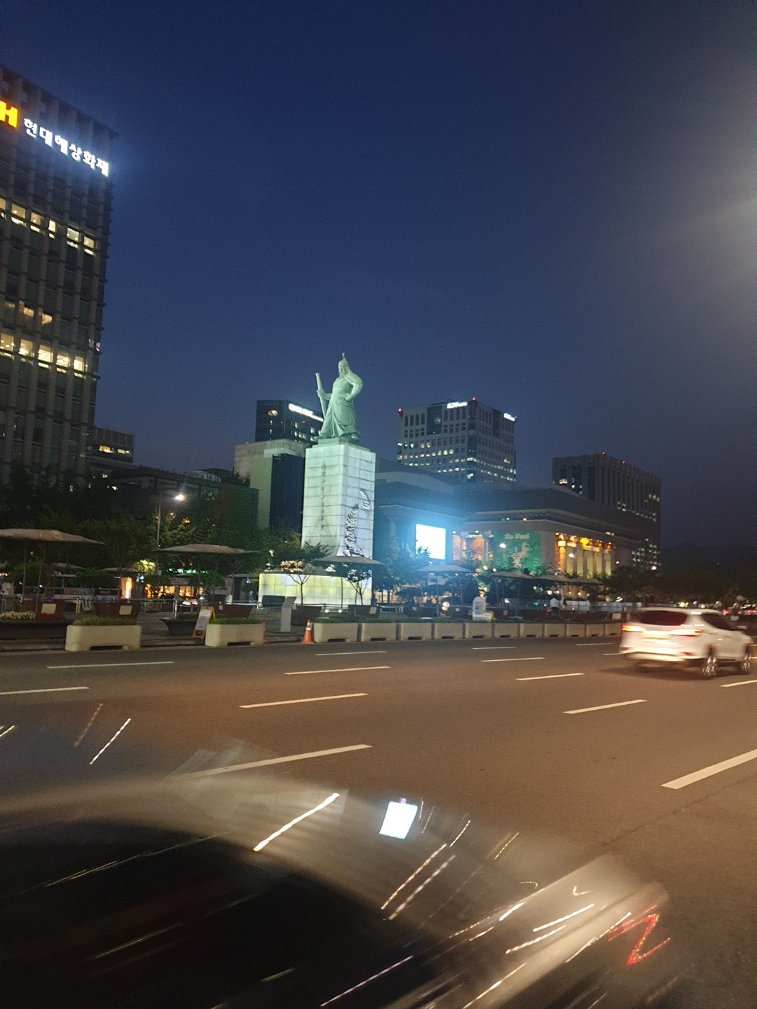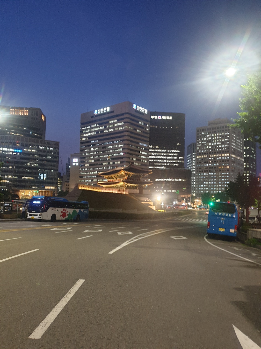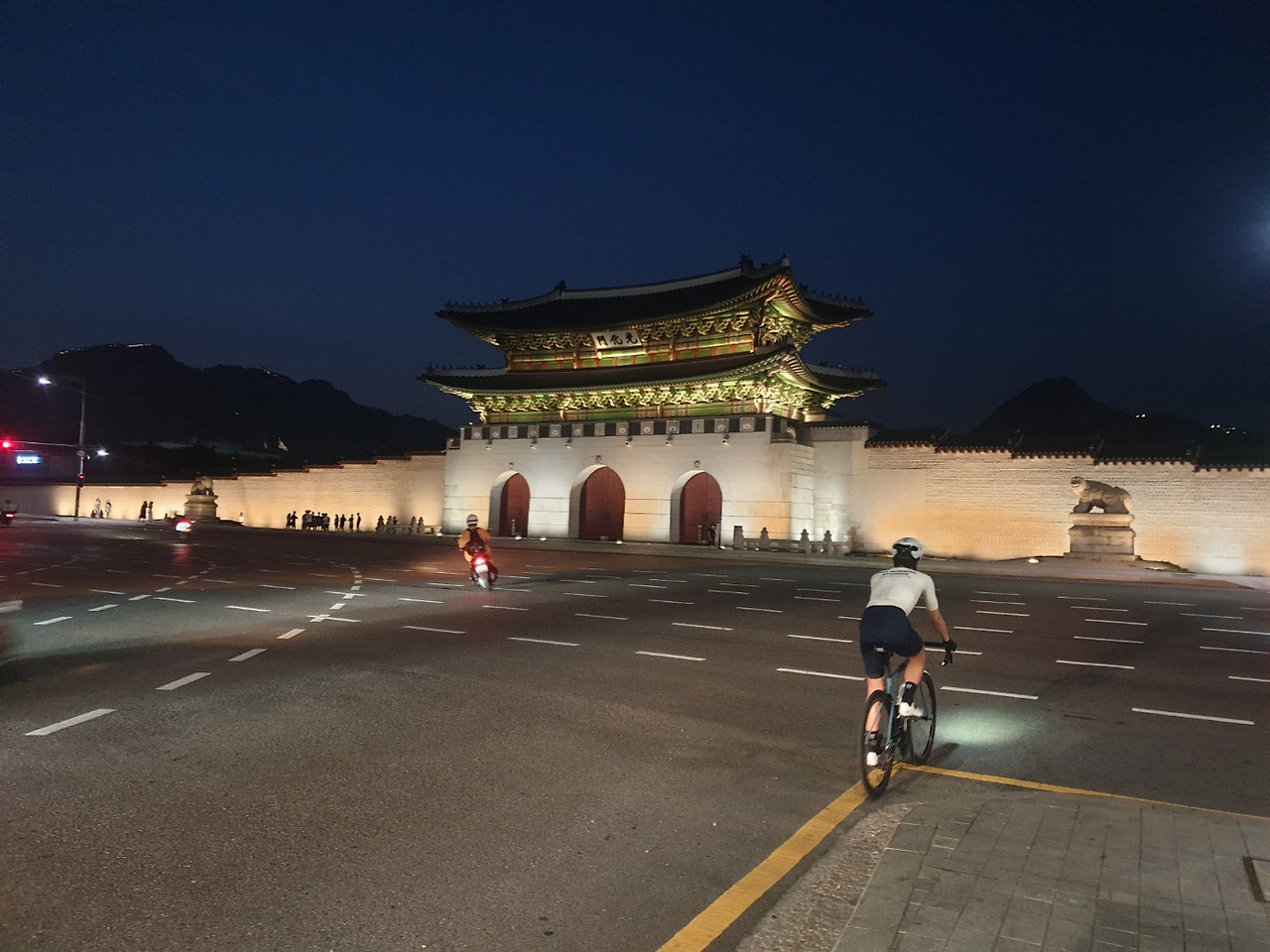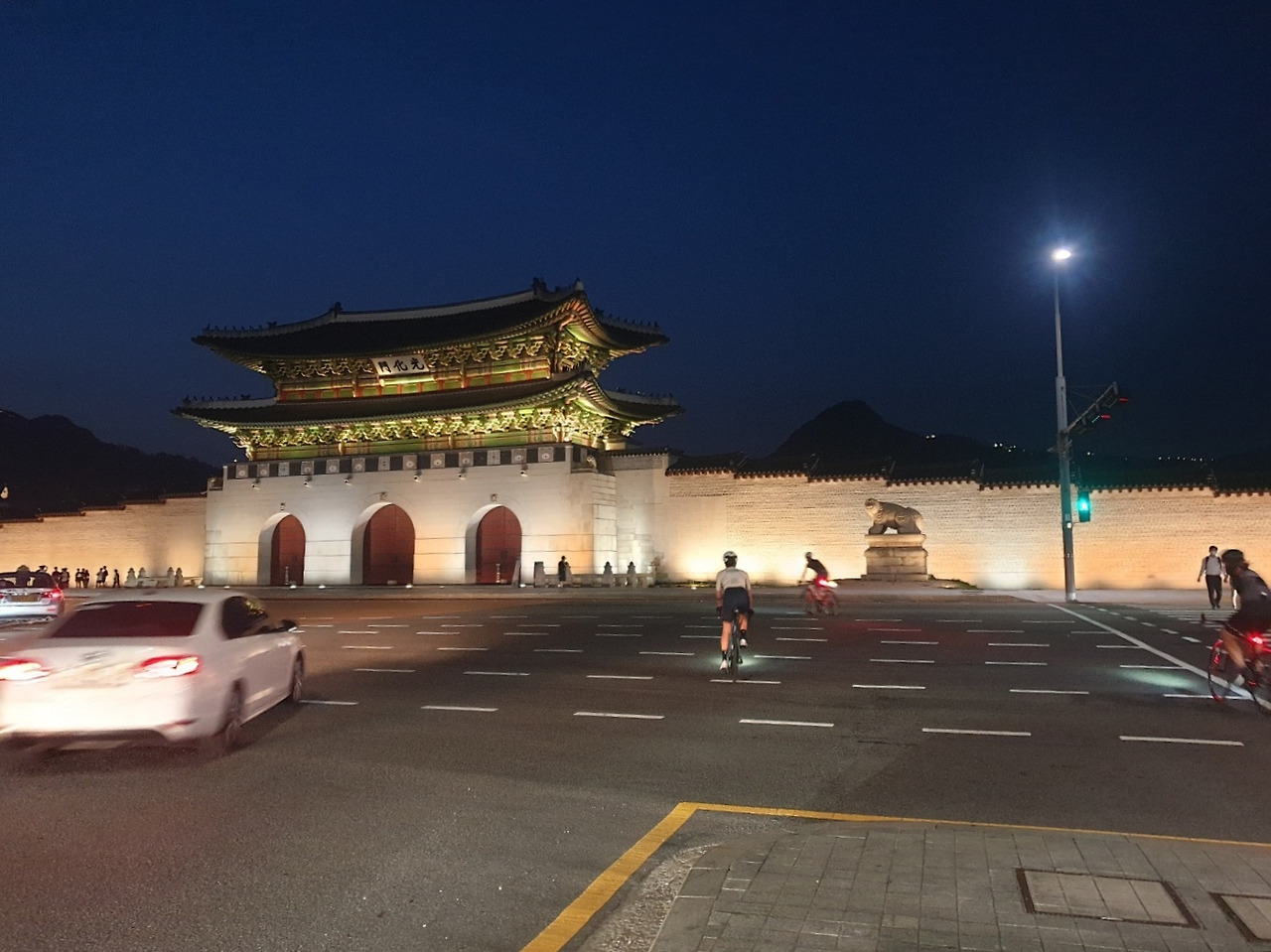 다운이 끝나고 남산도서관이 보이면 그대로 직진하다 좌회전하여 숭례문쪽으로 내려간다. 유리 외관으로 근사한 서울시청이 저 멀리 보인다. 이렇게 분주한 도심을 자전거로 달리고 있음에 가슴이 벅차다. 시청 앞부터는 가장 바깥 차선에 자전거 통행 표시가 있으므로 달리는 차들에 겁먹지 말고 내길을 가면 된다. 이순신 장군 동상이 보이는 세종대로 사거리를 지나 미 대사관을 지나 광화문 삼거리에 멈춘다. 좌회전 신호가 떨어지면 바깥 차선에서 크게 돌아 자전거길로 들어간다.