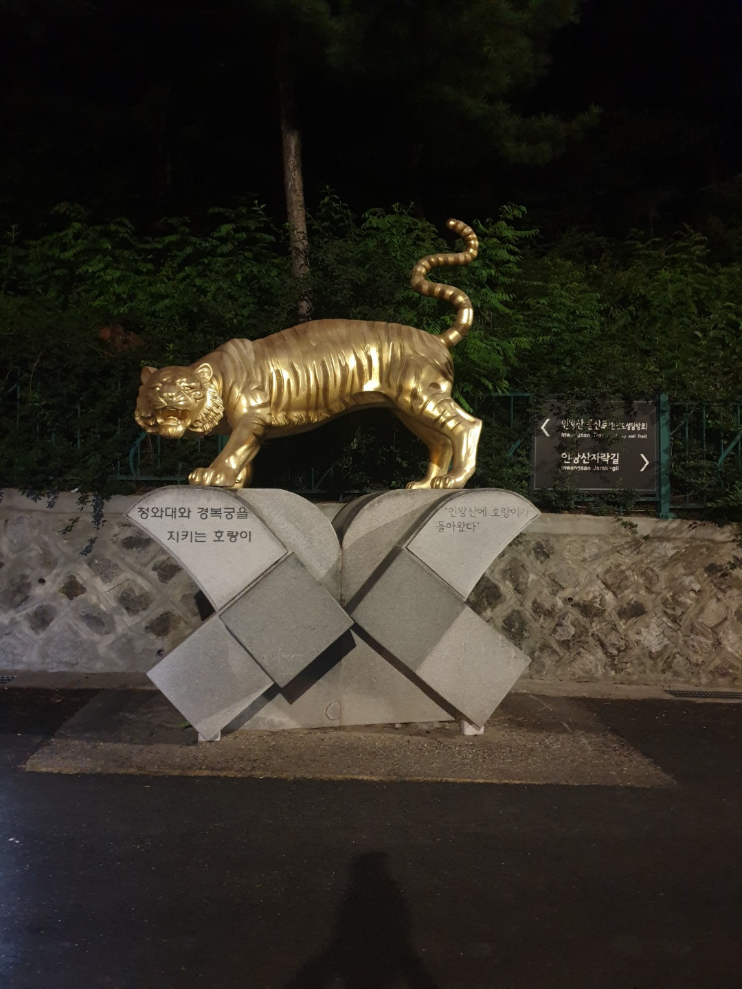 금빛의 인왕산 호랑이 조각상에 도달했다. 인왕산 정기를 가득 받은 호랑이가 용맹스럽다.