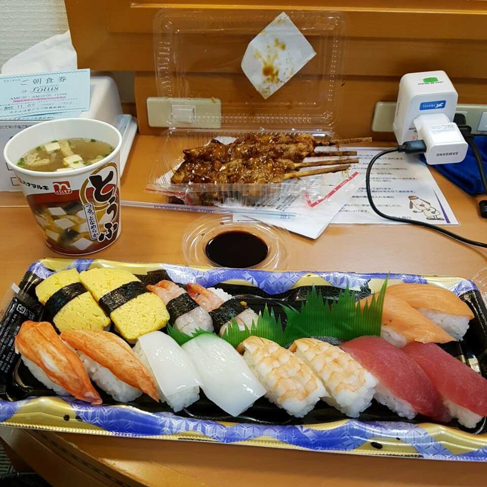 호텔에 오자마자 근처에 나하 메인 플레이스에서 초밥과 꼬치를 사서 폭풍흡입...