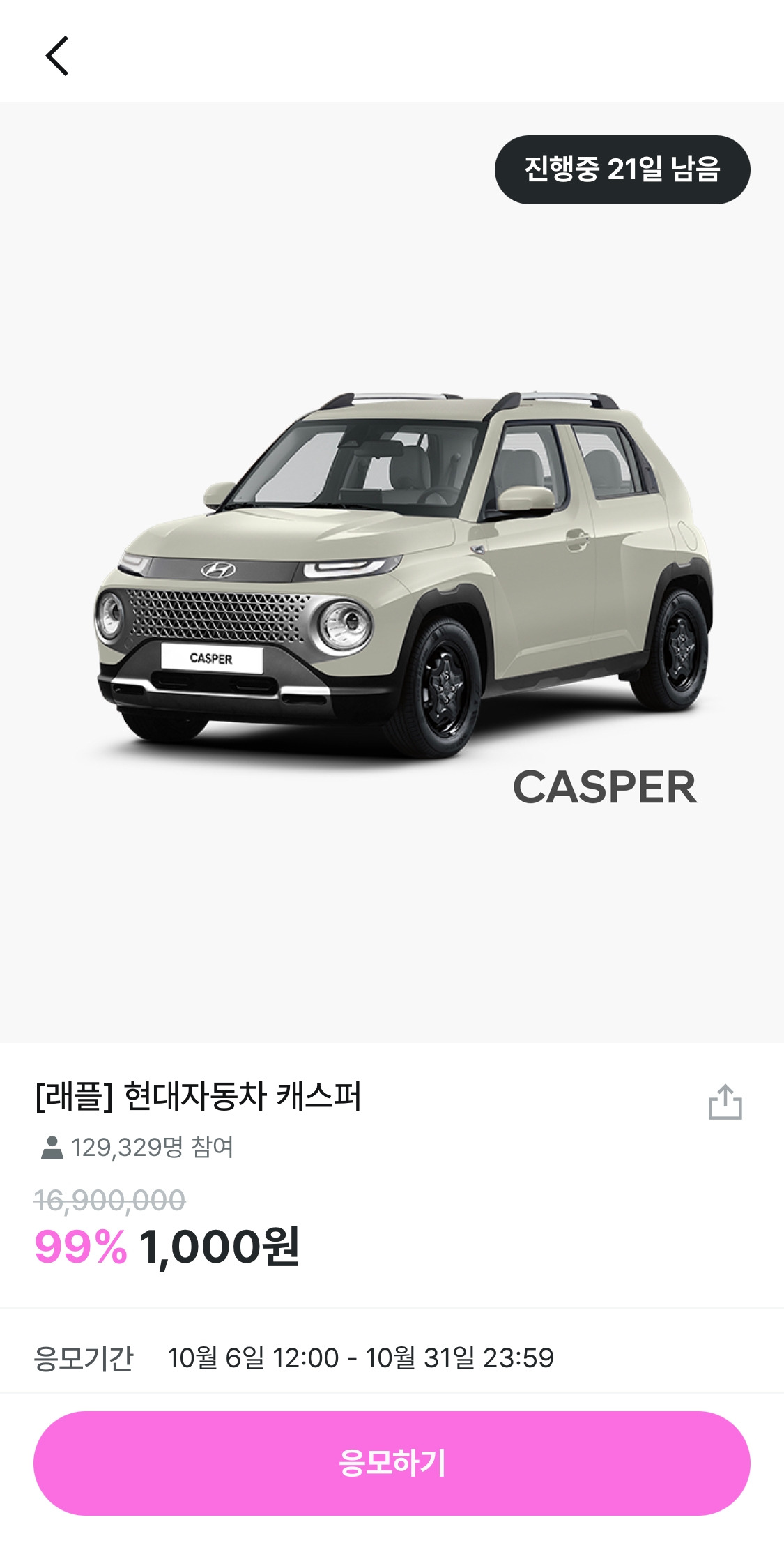 편리한 프로세스와 매력적인 상품 덕분에 매 래플마다 평균 10만 명 이상이 참여하고 있는데요. 최근에는 ‘현대자동차’와 제휴해 가성비 SUV로 2030에게 많은 사랑을 받고 있는 ‘캐스퍼' 래플을 진행하는 등 고객들의 전반적인 라이프 스타일을 완성할 수 있는 방향으로 상품군에 제한을 두지 않고 계속해서 확대하고 있습니다.