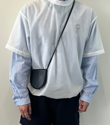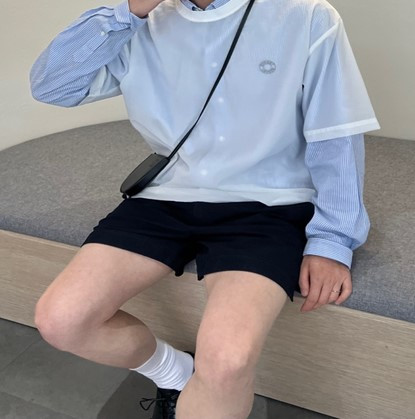 귀여운 느낌의 룩. 스트라이프 셔츠에 시어한 소재의 반팔을 레이어드하고, 반바지를 매치해 발랄한 분위기를 더해봤어요. 체구가 작은 편이라 귀여운 느낌으로 옷을 입는 걸 좋아하는데요. 최근에는 젠더리스 패션에도 관심이 생겨 시스루 상의와 짧은 기장감의 반바지를 함께 코디했어요.