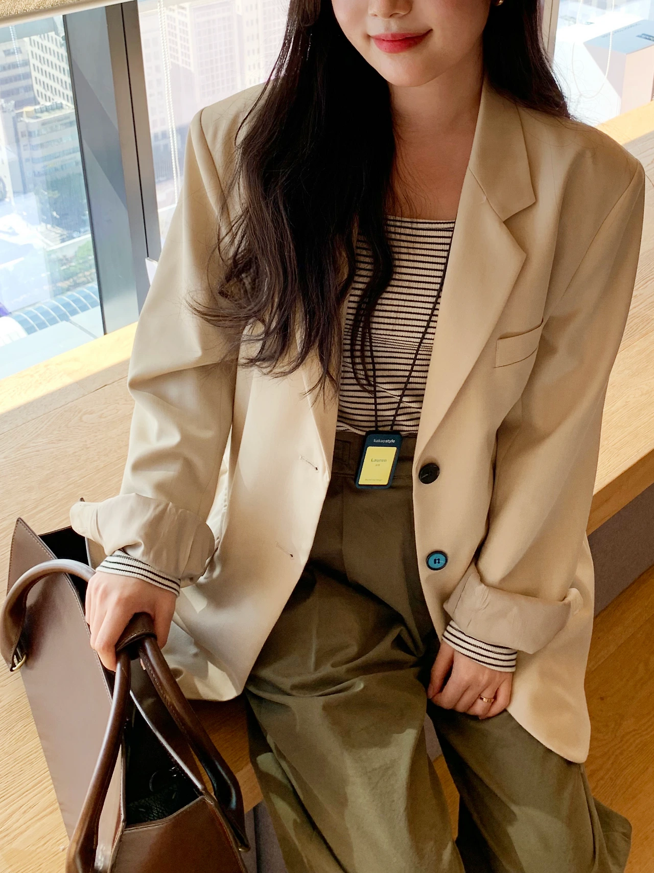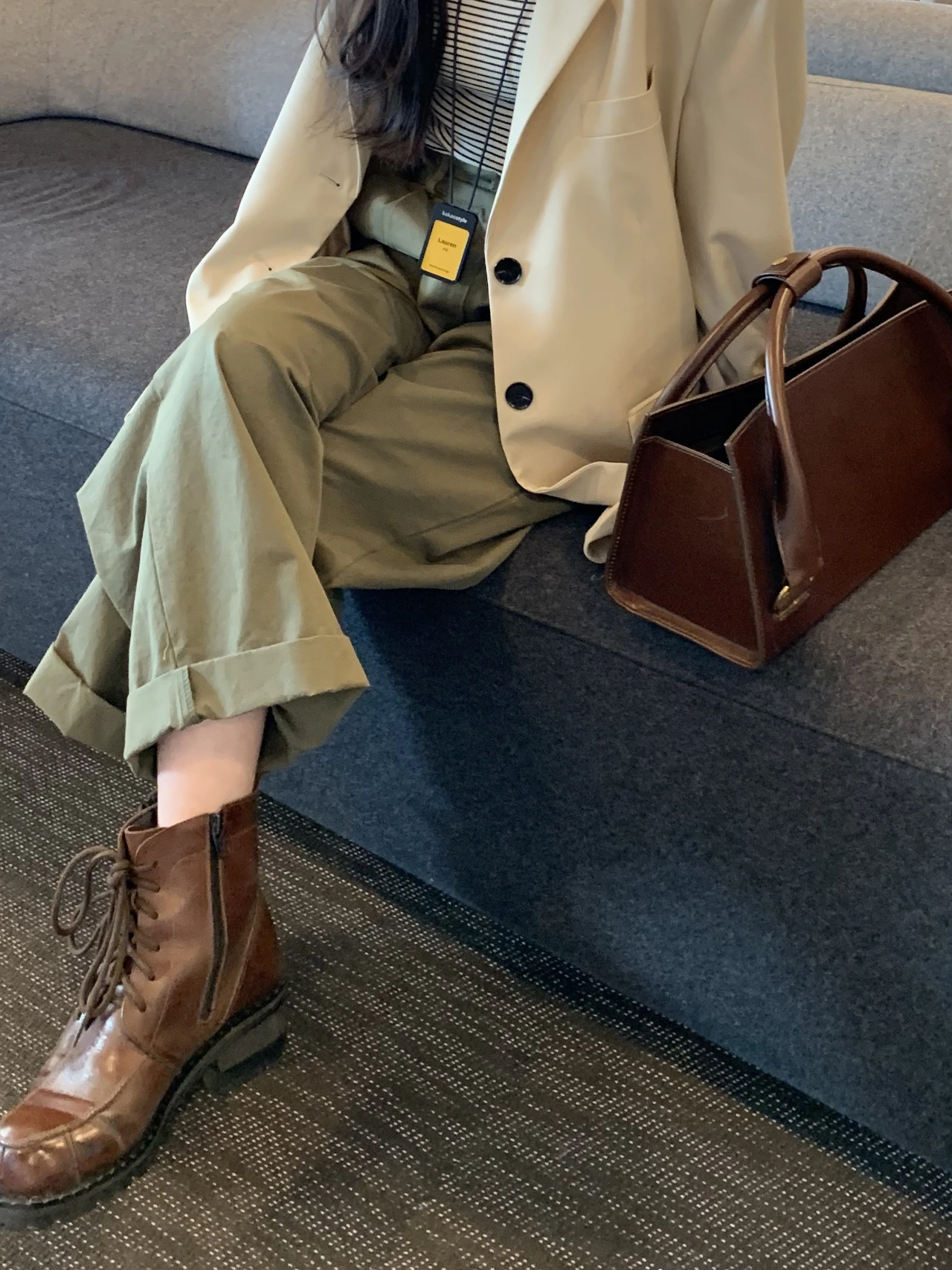 베이지색 재킷, 카키색 바지 그리고 브라운색 가방을 활용해 가을이 느껴지는 컬러로 분위기를 내봤어요. 저는 여름옷보다 가을옷을 좋아하는 편이에요. 따뜻한 색감을 좋아하기도 하지만 아우터로 포인트를 주는 룩을 좋아하거든요. 오늘도 제가 아끼는 오버핏 재킷을 활용해서 스타일링 해봤어요.