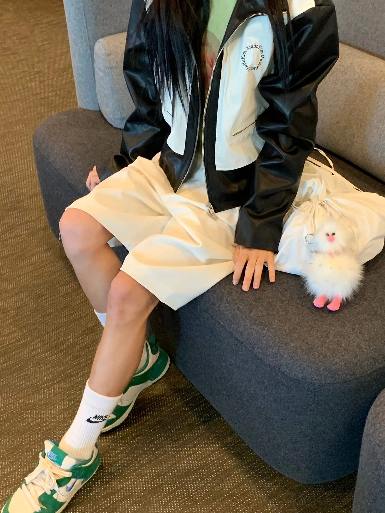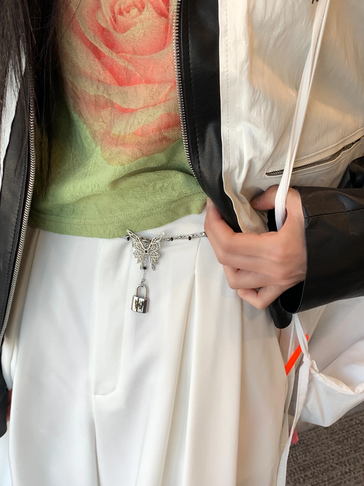 선선한 날씨를 대비해 재킷을 걸친 룩. 요즘 가죽이 유행이라고 해서 가죽 재킷으로 스타일링 해봤어요. 오늘 출근룩의 포인트는 바지에 착용한 액세서리인데요. 동대문에서 자재를 구매해 직접 만든 체인이에요. 상의에 있는 꽃과 잘 어울릴 수 있도록 나비가 그려진 체인을 같이 매치해봤어요.