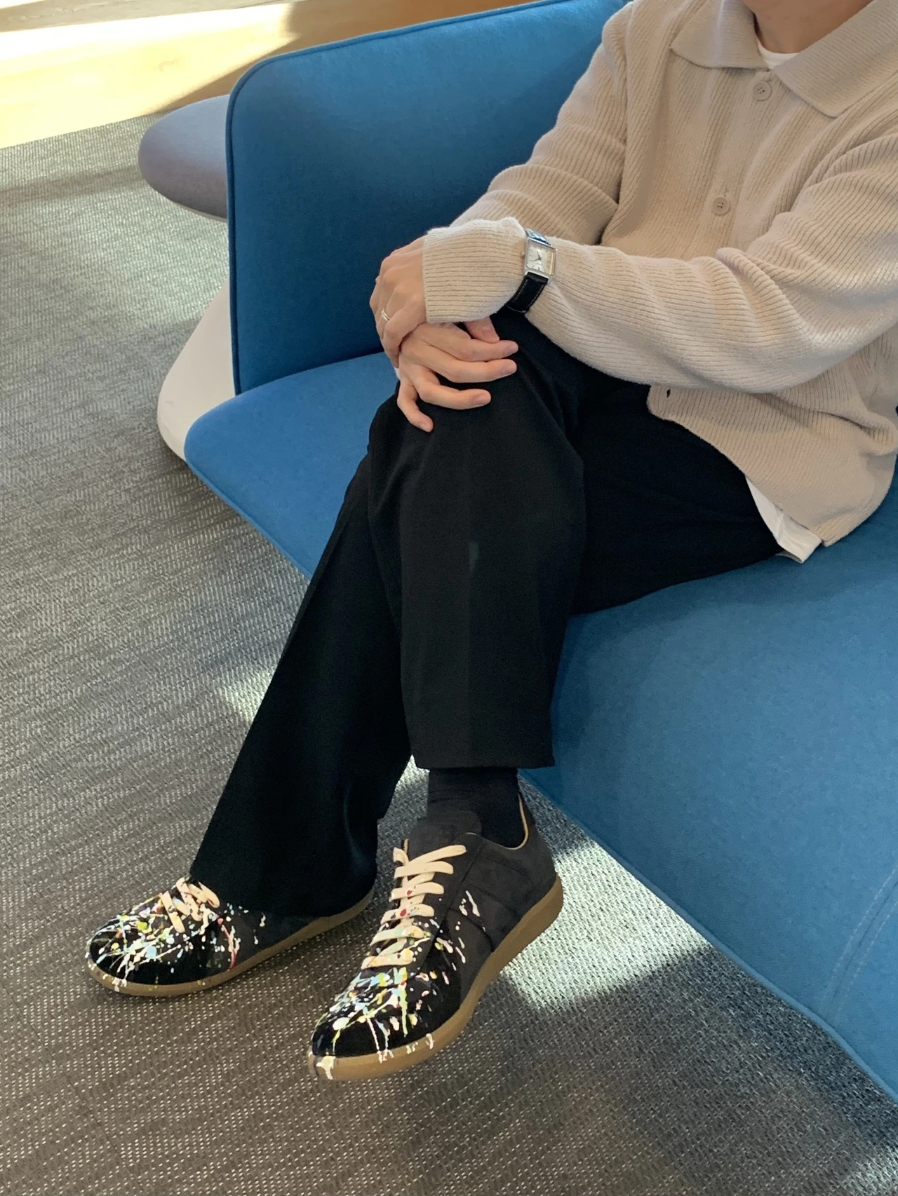 가디건을 활용한 미니멀 룩. 깔끔한 느낌의 아이보리 가디건으로 가을 느낌을 내봤어요. 전반적으로 색상을 많이 쓰지는 않으면서, 한두 개 아이템으로 포인트 주는 걸 좋아하거든요. 오늘의 포인트는 페인팅 디자인의 신발이에요.