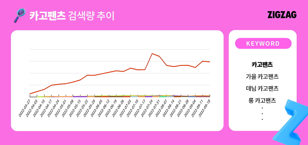 과연 지그재그 고객들도 카고 팬츠를 많이 찾을까요? 지그재그 앱 내 키워드 검색량을 확인해 본 결과, 올해 7월 말, 3만 6천 건이 넘는 검색량을 기록하며 정점을 찍었어요. 이후에도 2만 6천 건 이상의 검색량을 유지하며 꾸준하게 인기를 얻고 있어요. 최근 2주(9/13~9/26) 동안의 카고 팬츠 거래액을 조사해보니 전년 동기 대비 17배(1633%) 증가한 것으로 나타나기도 했어요.