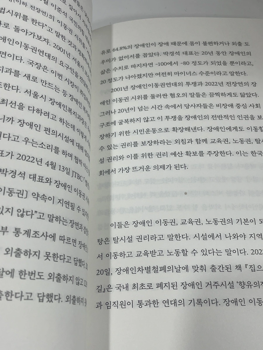 장애를 “질병”으로 바라보는 것, 때문에 장애는 “치료”해야하는 것. 무의식 속에 우리는 장애를 정상이 아닌 것으로 바라보았고, 그렇게 교육받았다. 이러한 인식은 “비장애인”의 시각에서 발생했다고 해도 과언이 아니다. “산업화는 장애를 적극적으로 만들어냈다”(p.20)고 한 저자의 말과 같이 급격한 산업화가 나타난 뒤, 인간은 오로지 노동을 위한 몸만이 정상적인 것으로 인정받는다. 이는 비장애인의 “정상”으로서의 강요이자, 폭력이다. 장애인이 원하는 것이 “장애의 종식”이라고만 믿는 비장애인의 시각에서 벗어나 진정으로 장애인이 원하는 바가 무엇인지 묻는 것이 누군가의 고통에 “공감”할 수 있는 첫걸음이 아닐까 싶다.