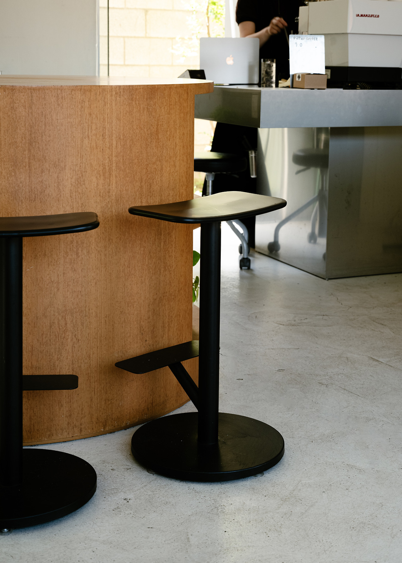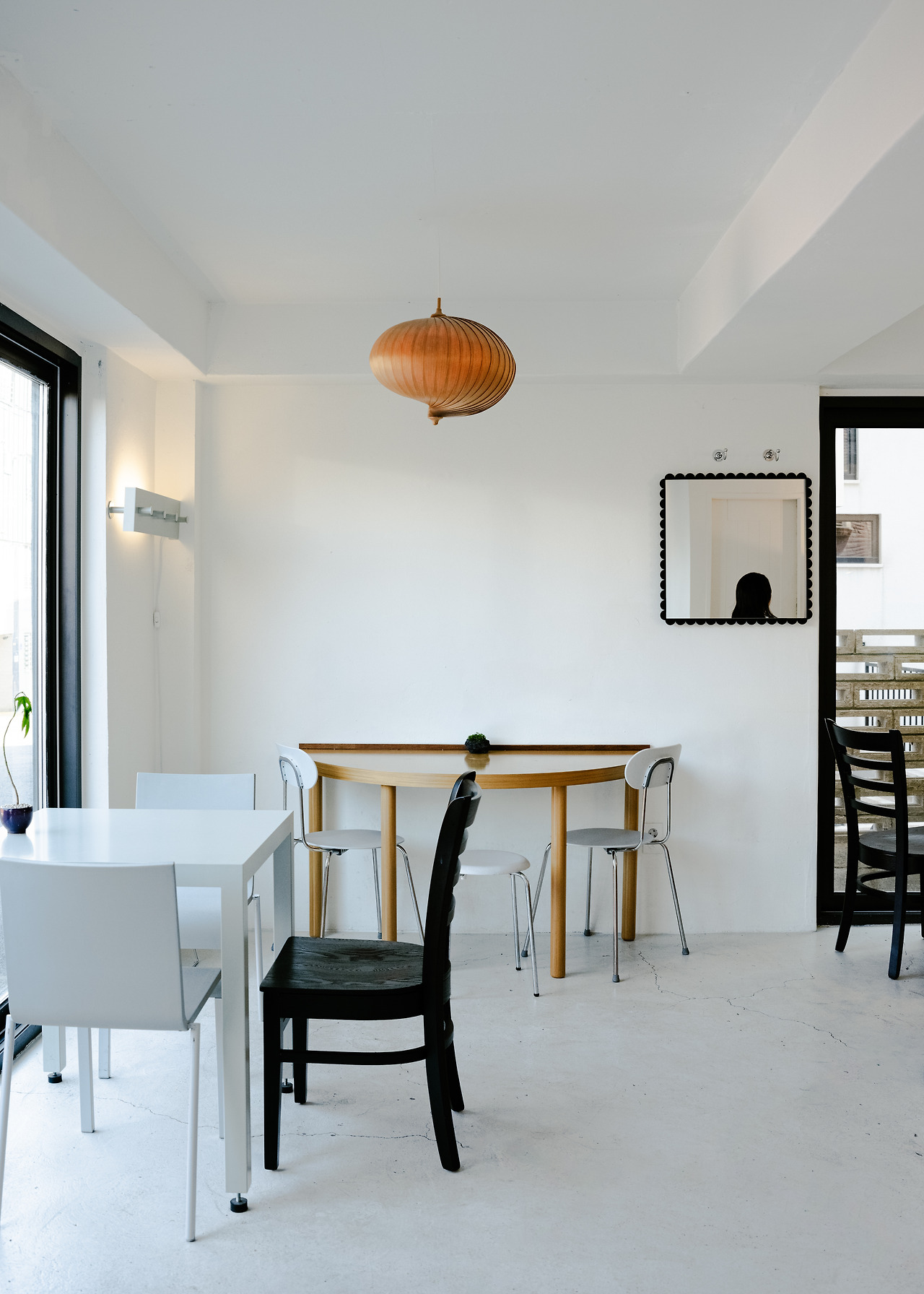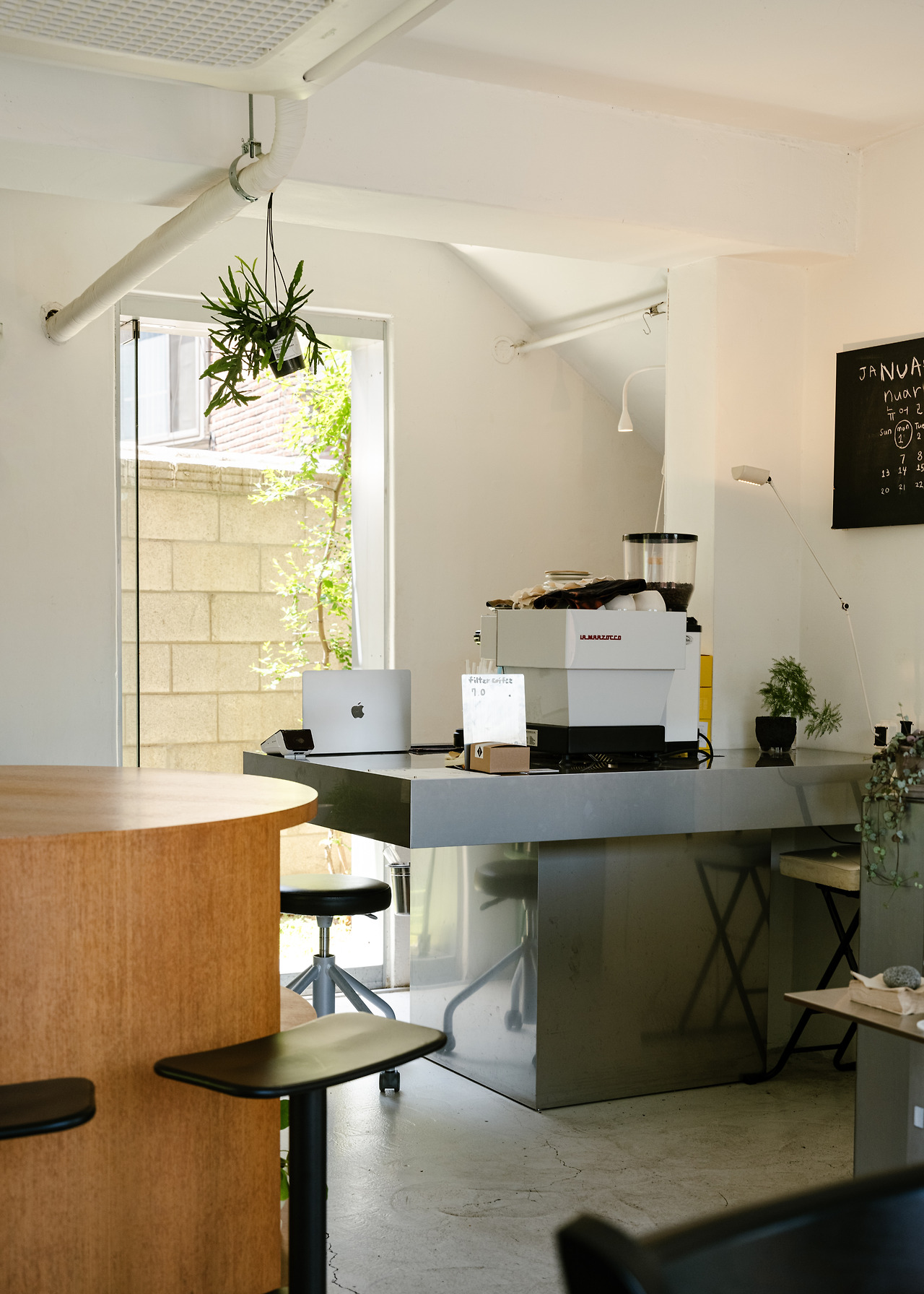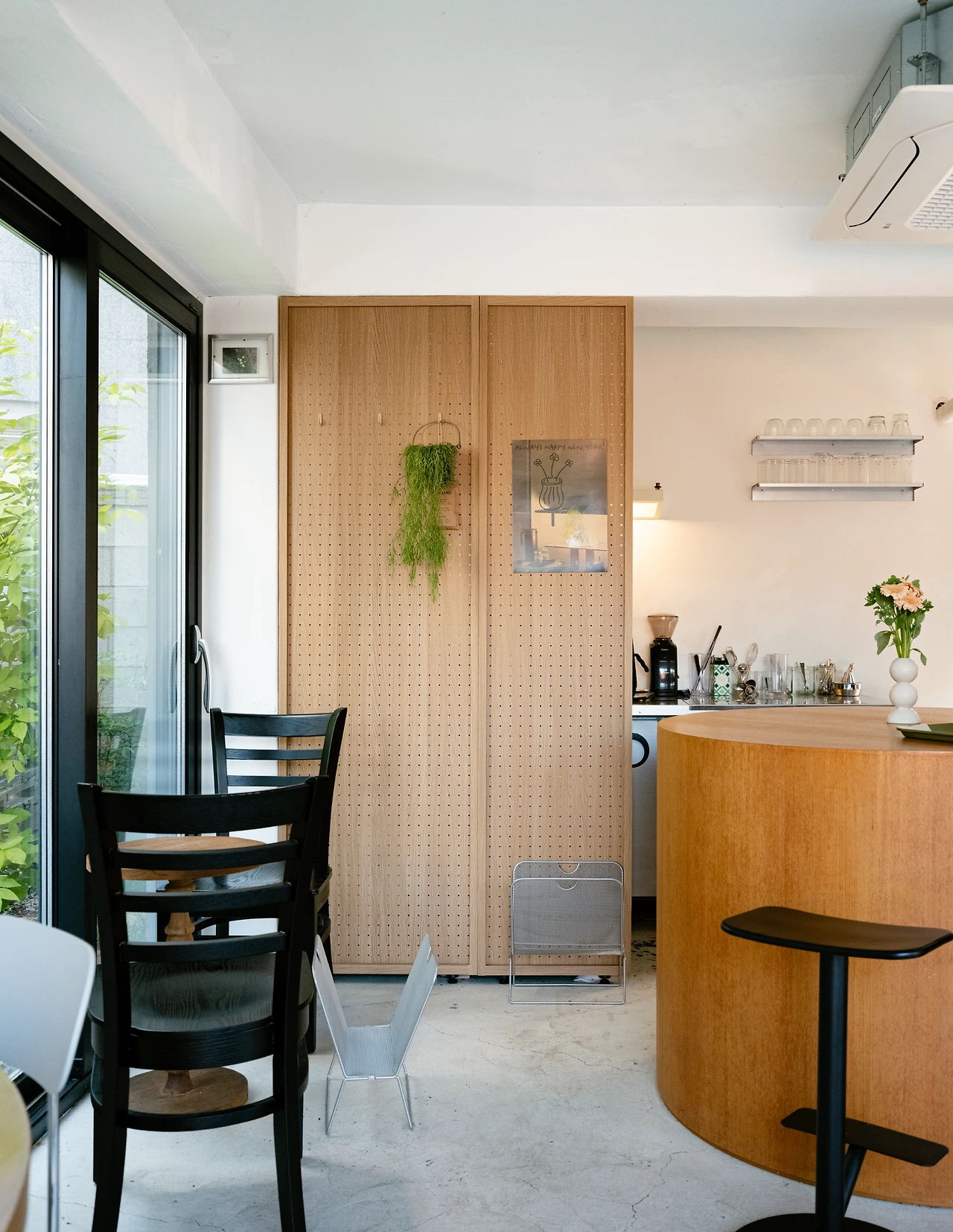들어서자마자 눈에 띈 건 중앙에 위치한 타원형의 목재 가구와 검은색 의자 두 개였다. 손님이 앉아 커피를 마시는 바의 형태가 되기도, 메뉴를 손님에게 보내기 전 마지막으로 점검하는 키친의 일부가 되기도 하는 곳이다. 내가 머물렀을 땐 사장님의 지인들이 이 자리에 앉아 커피를 마시며 사장님과 담소를 나누었다. 요즘엔 손님이 얼마나 찾아오는지, 커피는 어떤 원두를 쓰는지, 혼자 일하면서 어려운 점은 없는지, 신상 카페가 겪는 고초를 두런두런 이야기하는 장면이었다.
