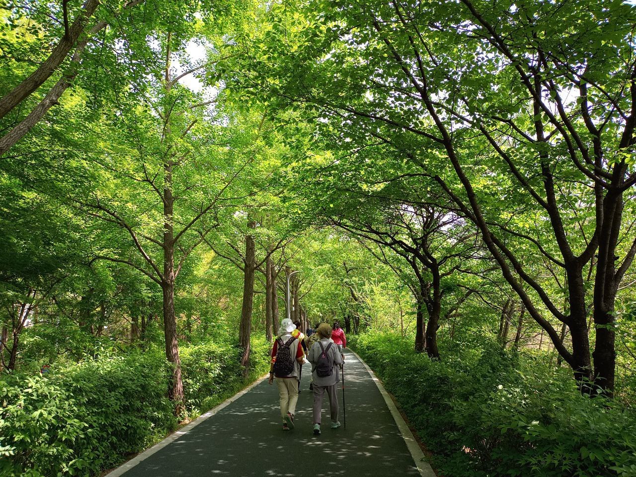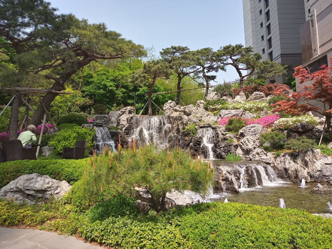 도중에 개포동 방향으로 달터근린공원에 오른다. 이름은 공원이지만 동네의 야산이라 제법 오르막 내리막이 반복된다. 개포동에 재건축한 새 아파트의 정원과 동네공원에 예쁜 꽃이 피었다고 최근에 그리 이사한 친구가 초대하여 그 친구의 안내로 같이 가는 길이다. 과연 달터공원의 산속 같은 숲길도 아름답고 아파트 정원도 절로 감탄이 나오게 한다. 인공폭포 주변 바위틈에서 아직도 철쭉이 환하게 웃고 있다.
