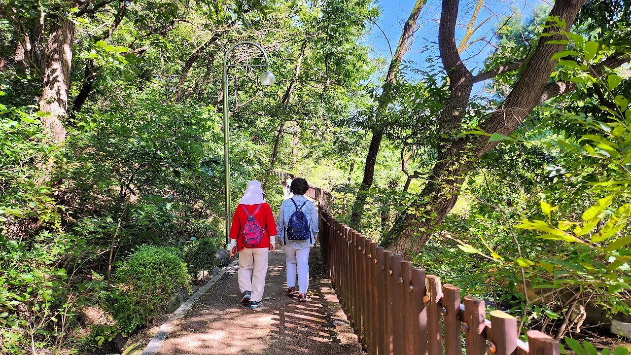 우리는 책테마파크 도서관 건물 옆으로 약간 오르막 산길로 오른다. 옆으로는 황톳길이 이어져 있어 맨발로 걷는 사람도 꽤 보인다. 요즘 맨발 걷기가 유행인 것 같다.