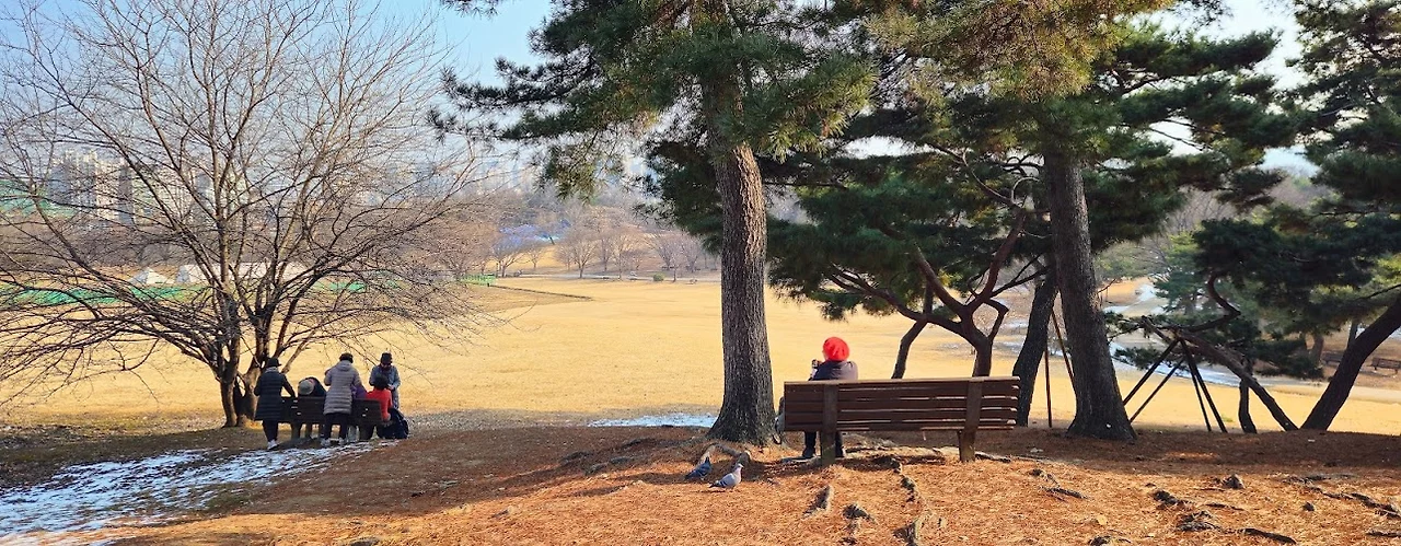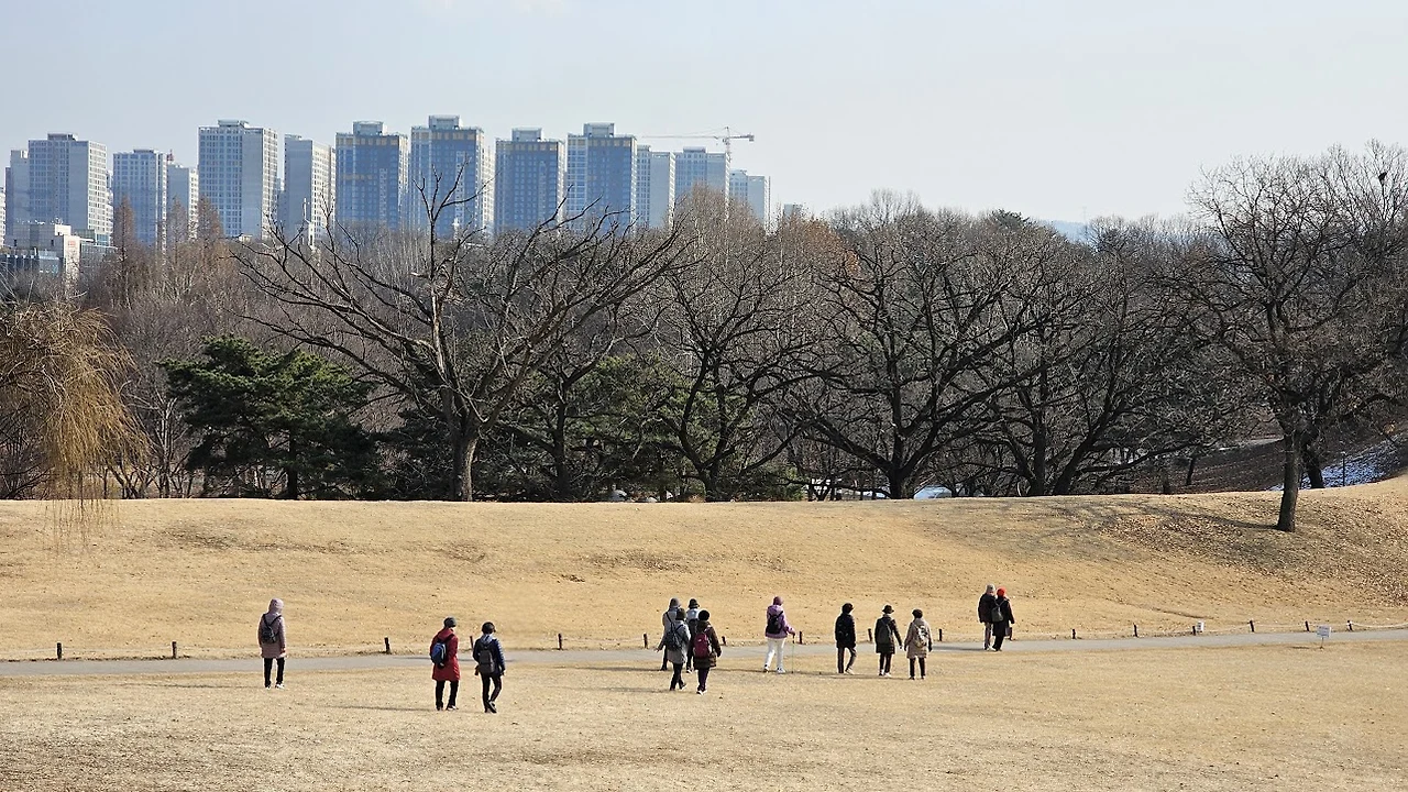 이 토성은 백제 초기의 토성으로 6~7 미터 밖에 안 되는 나지막한 언덕처럼 보이지만 약간의 경사길을 올라가야 하기 때문에 더운 봄날이나 여름에는 우리가 피해 가는 길이다. 오늘은 햇볕이 뜨겁지 않으니 그늘이 없어도 힘들이지 않고 올라간다. 토성 위의 정상에도 망월봉이라는 이름이 있는데 이 망월봉으로 올라가길 잘했다. 여기에서 훤히 내려다보이는 공원과 이 주변 송파구 일대의 풍경이 일품이다. 엘타워도 보이고 넓은 경사면에 펼쳐진 노란 잔디밭 위에 저 멀리 그 유명한 올림픽공원의 명물 나 홀로 나무도 보인다. 지난주 눈이 왔을 때 눈 위에 서 있는 나 홀로 나무를 보았다면 더 멋졌을 텐데.. 나흘 전에 내린 눈도 지금은 거의 다 녹고 그늘진 언덕이나 길가에 눈이 드문드문 남아있을 뿐이다. 눈 올 때 다시 한번 와 보아도 좋겠다.