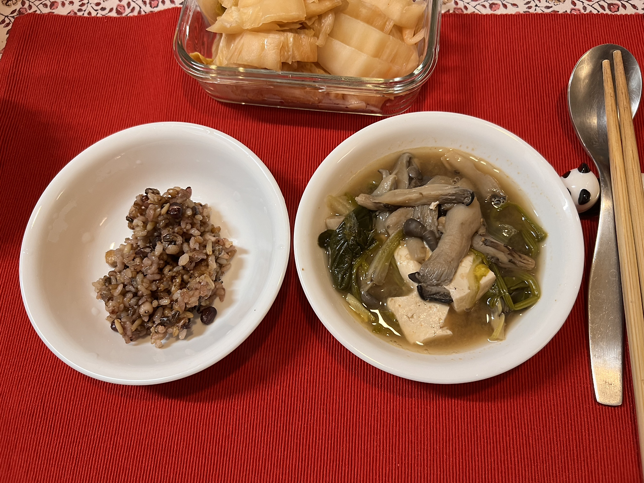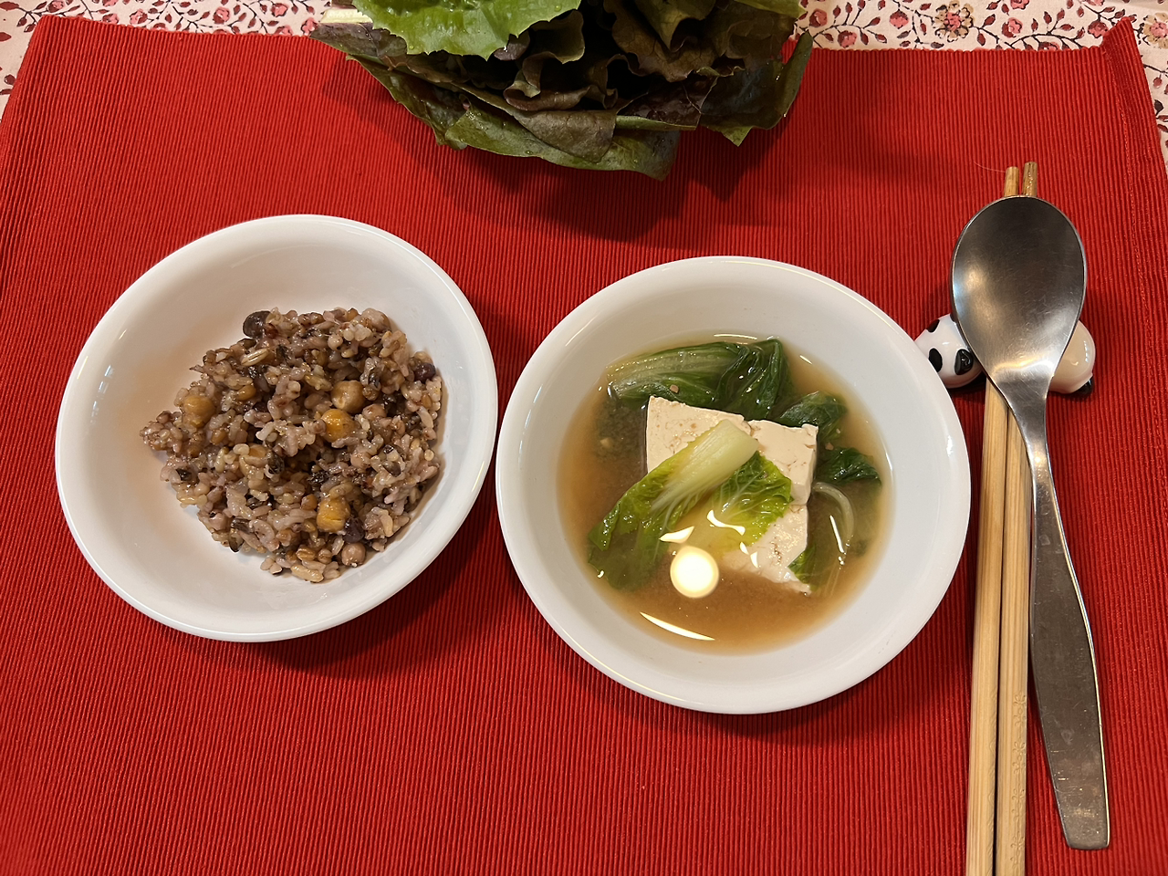 밥은 평소 먹던 양의 3/5, 채소와 두부가 들어간 맑은 된장국을 먹는다.