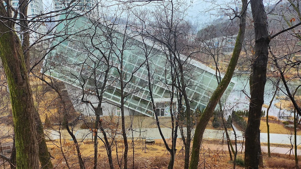 비를 맞아 벤치가 젖었으니 앉지도 못하고 곧장 연못 앞의 온실 쪽으로 간다. 그런데 온실 건물이 독특하다. 커다란 유리상자를 삐딱하게 기울여서 한 귀퉁이를 반쯤 땅에 묻고 세워놓은 형상이다. 건축가의 발상이 재미있다고 생각하며 온실 안으로 들어간다.