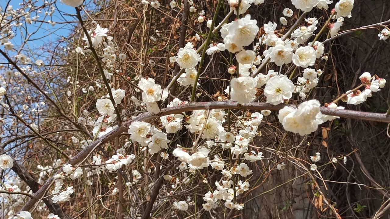 용답역과 신답역 사이 전철 선로변 담벽 옆에 심긴 백매화는 열흘 전만 해도 회색담벽 때문에 드문드문 피기 시작한 흰색 꽃이 아직 그 빛을 제대로 내지 못하고 있었지만 이제는 만개하여 화사하게 빛을 내고 있고 아담한 대나무 숲 앞에 피어 있는 두어 그루 홍매화의 붉은빛은 아주 선명해졌다. 이 길은 최근 몇 년 사이에 서울의 매화명소로 소문이 나서 산책하는 사람들이 꽤 많다. 그동안에 이곳저곳 매화나무를 더 많이 새로 심어서 내년 후년의 더욱 풍성한 매화길이 기대된다. 이 길을 지나며 여러 해 전 여기서 만개한 매화를 처음 발견하고 감동했던 순간이 기억났다.