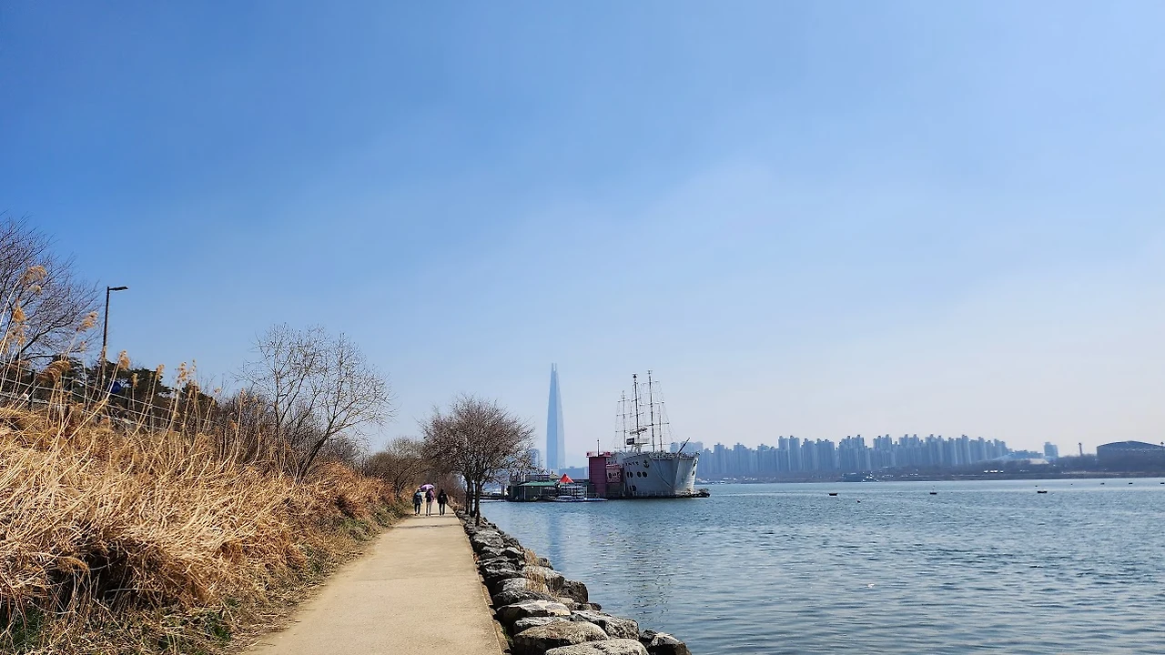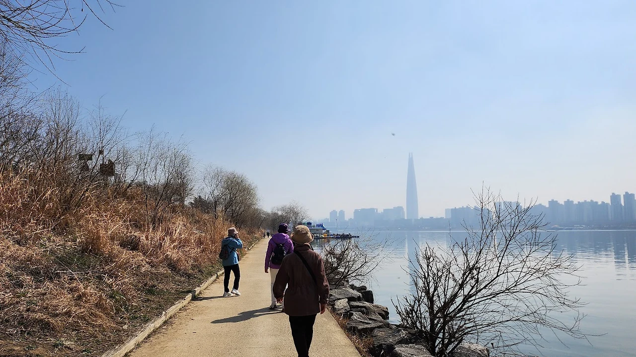 우리는 영동대교 직전에서 뚝섬 나루마당이라는 곳까지 갔다가 되돌아서 강변을 따라 잠실대교 방향으로 걷는다. 마침 날씨가 좋아서 강변산책길에서 보는 하늘과 강물이 파란색으로 아름답지만 멀리 보이는 잠실대교와 종합운동장과 롯데타워는 미세먼지에 가려서 윤곽이 흐릿하니 매우 아쉽다.