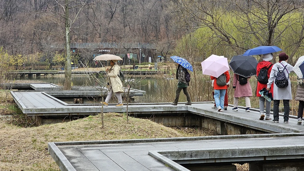 점심 후에 공원을 둘러보는데 길옆에 개나리 동산이 보인다. 만개한 개나리가 화사하게 빛을 발하고 있다. 오늘은 개나리도 보게 되니 작년에 가 보았던 응봉산 개나리동산을 올봄에는 건너뛰어도 될 것 같다. 개나리 언덕 맞은편에 오른편으로 월영지라는 연못이 있는데 연못 가에 아직도 남아있는 작년 가을의 마른 갈대가 보슬비 내리는 연못에 운치를 더해준다.