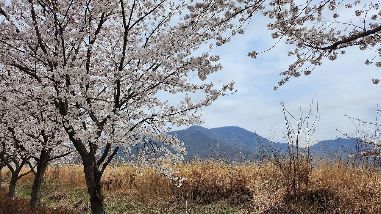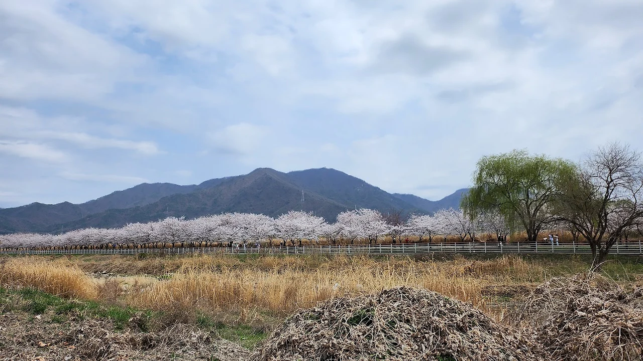 이 벚꽃길이 특히 더 아름다운 이유는 배경이 좋기 때문이다. 탁 트인 들판에 한강 건너편에는 예봉산이, 이쪽 오른편에는 검단산이 우람하게 서서 배경을 이룬다.