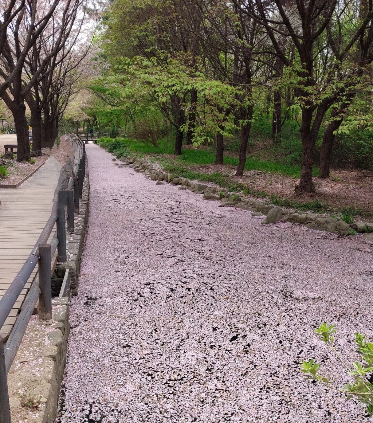 은행나무길을 지나 이제는 꽃이 거의 지고 있는 벚나무길로 들어선다. 그런데 길가에 따로 연분홍 꽃길이 길게 이어져 있다. 멀리서 볼 때 떨어진 벚꽃 잎이 눈 같이 하얗게 쌓여서 눈 길처럼 보였는데 가까이 가보니 물 위에 떠있는 벚꽃잎들이다. 벚나무길 옆으로 좁다란 인공 개울이 흐르는데 그 물 위에 꽃잎이 떨어져 물길을 덮은 것이다. 꽃잎들이 가득하게 물길을 덮어 흐르는 물이 보이지 않을 정도이다. 혹시 어떤 사람이 이 아름다운 풍경에 취하여 물 위의 벚꽃을 한번 “즈려 밟고” 걸어가 보려다가는 개울물에 빠지는 해프닝이 일어날지도 모르겠다.