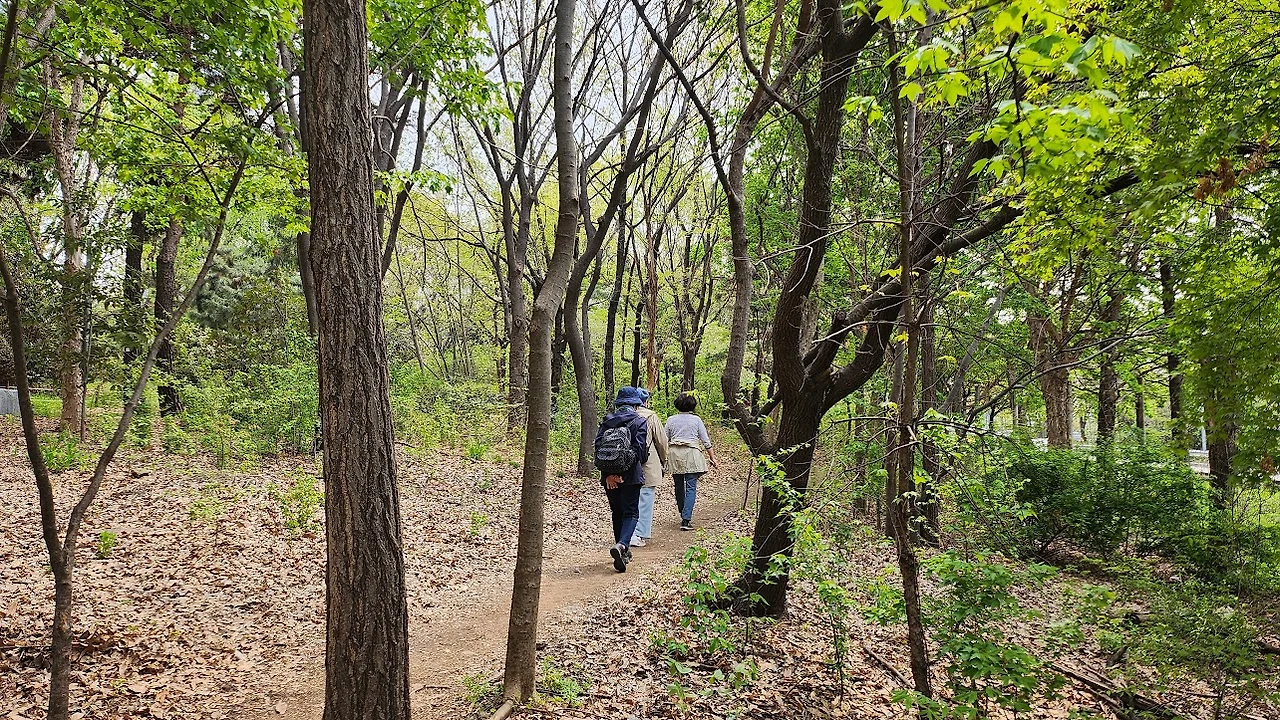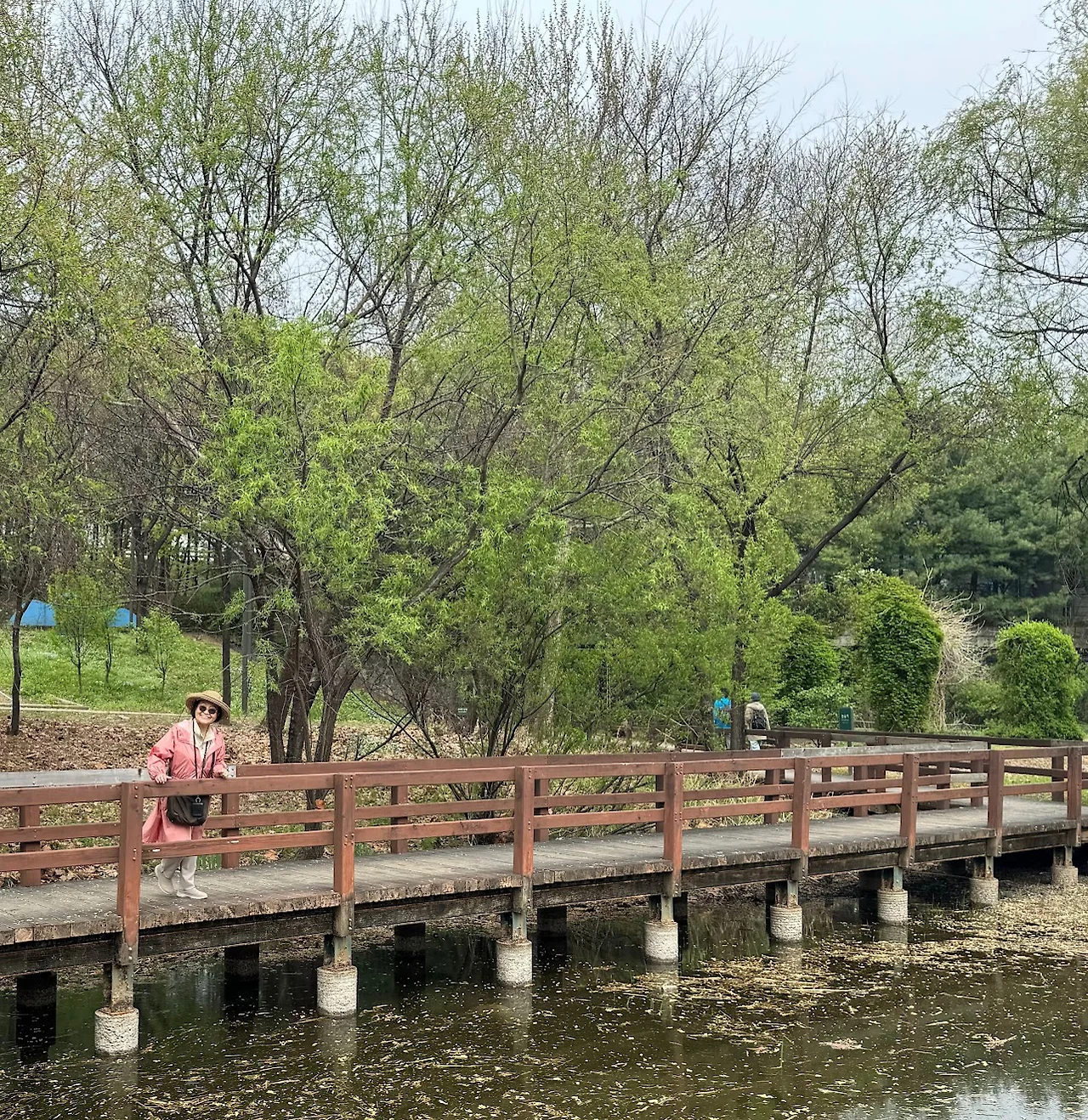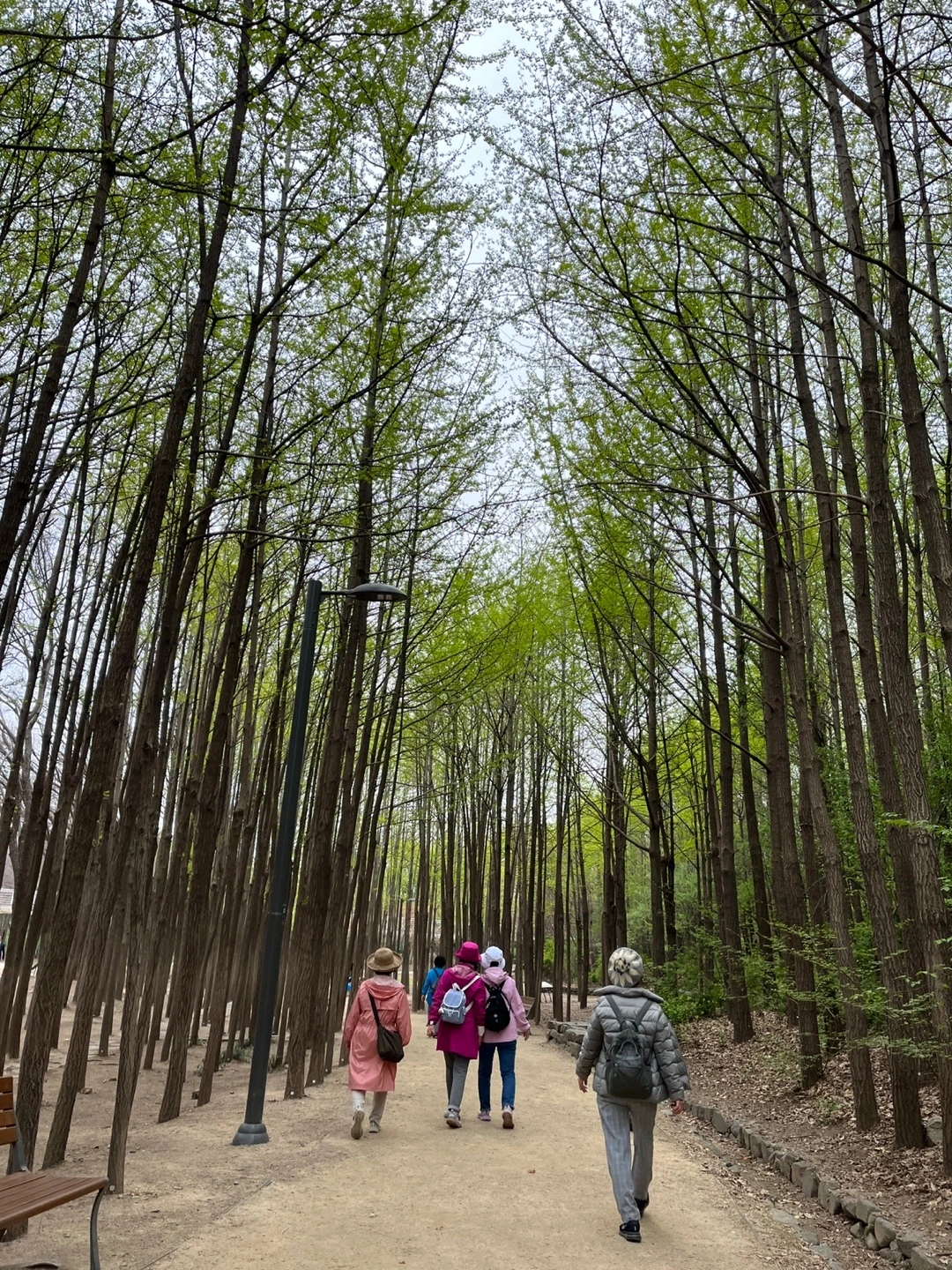 이 길이 끝나면 소나무 숲이 나타나고 그 아래로 환상적인 튤립 꽃밭이 양 옆으로 오색양탄자처럼 펼쳐진다. 여러 종류의 다양한 색깔의 튤립이 활짝 피어 있고 반쯤 피거나 이제 막 피려는 봉우리도 많이 섞여 있어 그 다채로움에 눈이 황홀해진다. 작년 보다 꽃이 훨씬 더 많이 핀 것 같아 우리가 올해는 때를 잘 맞추어 왔다고 좋아한다. 겨울 동안 물이 없던 중앙호수에 물이 가득 채워져 있고 호수 주변에도 튤립이 많이 심겨 있어 호수와 어울려 매우 아름답다. 호수를 돌아가면 성수고등학교옆으로 가을단풍길이라는 숲 속길이 이어지고 계속 가면 습지생태원에 이른다. 사람들이 보통 이곳까지는 잘 찾아오지 않아서 조용히 걷고 쉬기 좋은 곳이다. 습지생태원을 한 바퀴 돌고 유아숲 체험장 옆에 있는 정자에서 쉬어 가기로 한다.