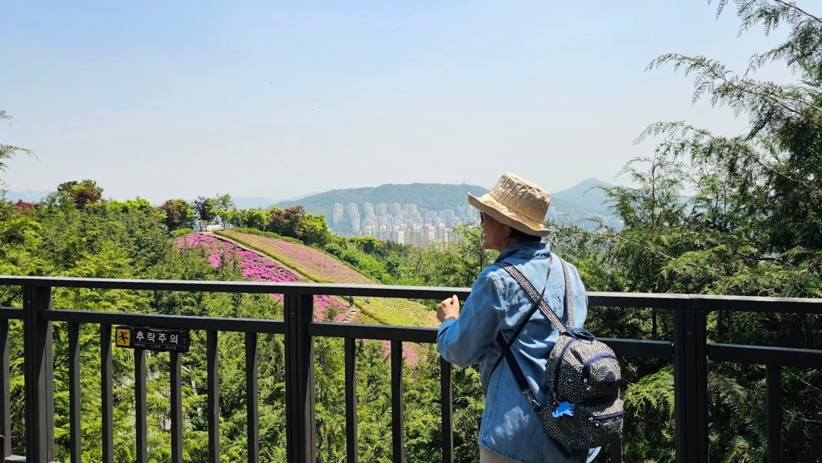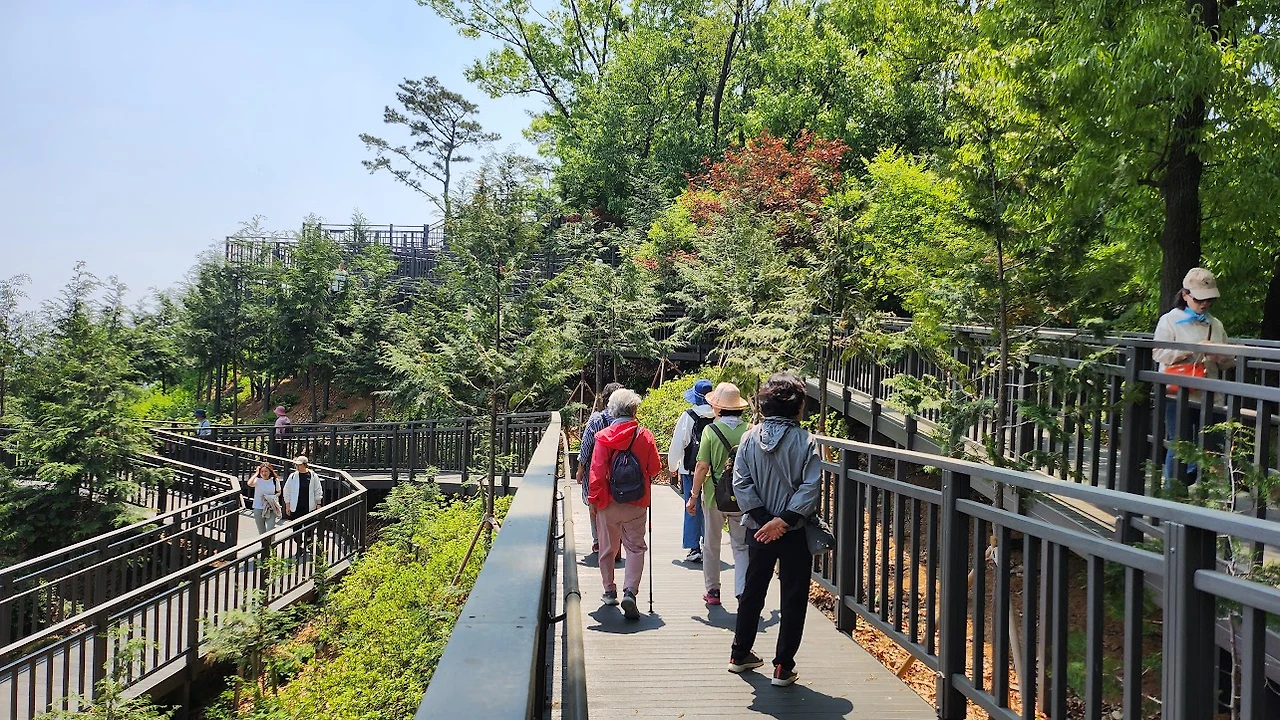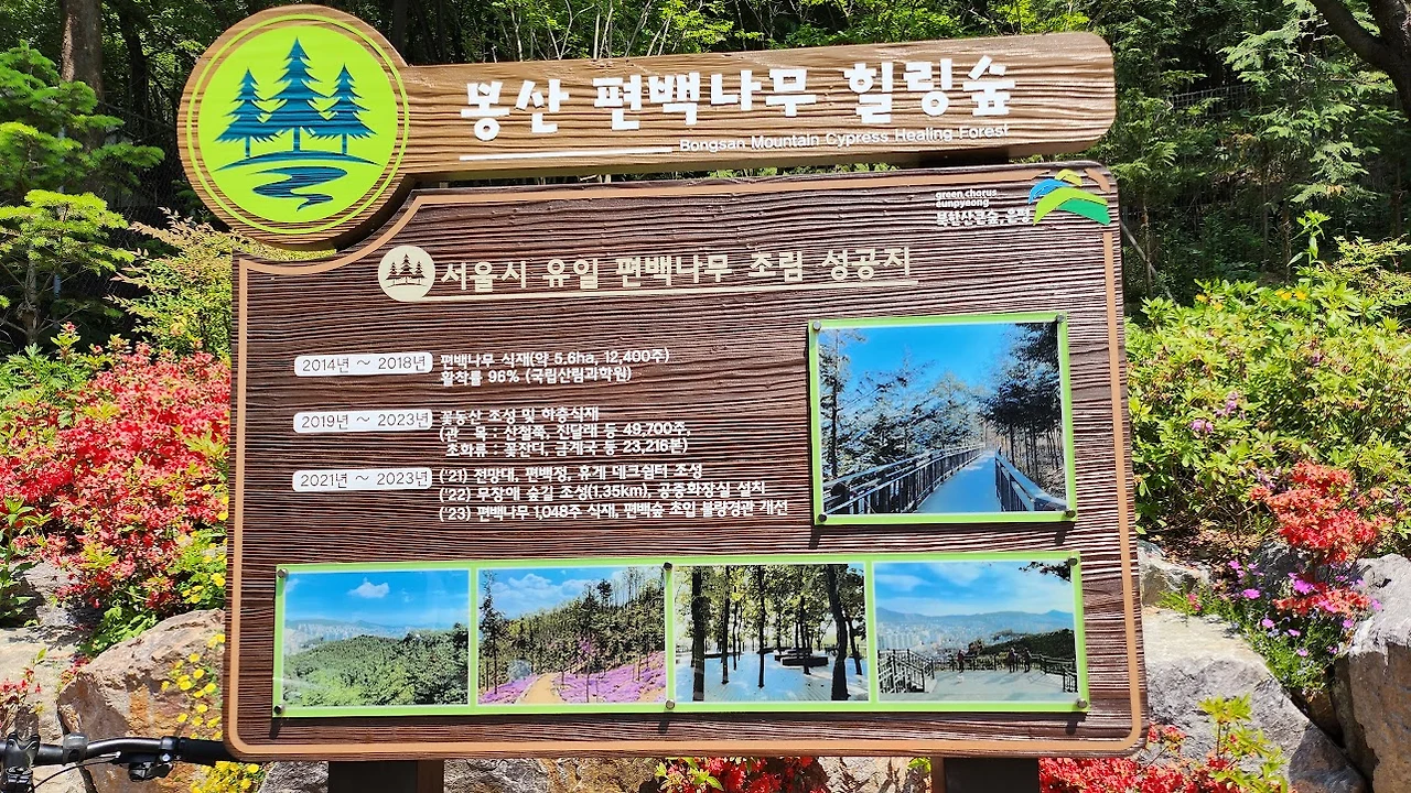 새절역에서 마을버스 10번을 타고 숭실고등학교까지 간다. 걸어가도 20분이면 갈 수 있는 거리이지만 오르막길이고 그늘도 없어 버스 타기를 잘한 것 같다. 버스 종점에서 5분쯤 올라가니 “봉산 편백나무 힐링숲”이라는 안내판이 서 있다. (요새 사람들은 “힐링"이라는 말을 참 좋아하는 것 같다. 지난주에 갔던 불암산 “힐링타운”도 그렇고.) 여기서 봉산 정상으로 올라가는 무장애숲길이 시작된다.