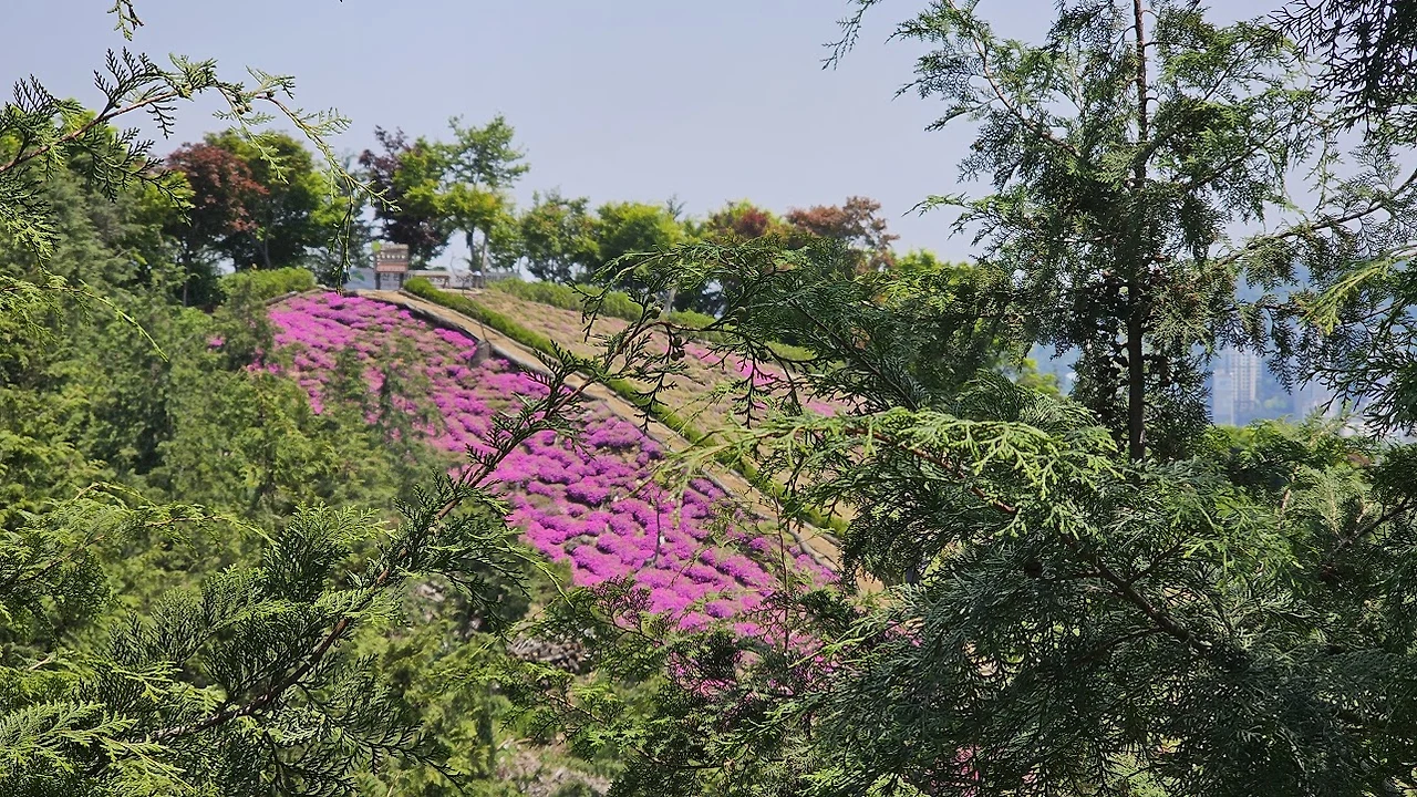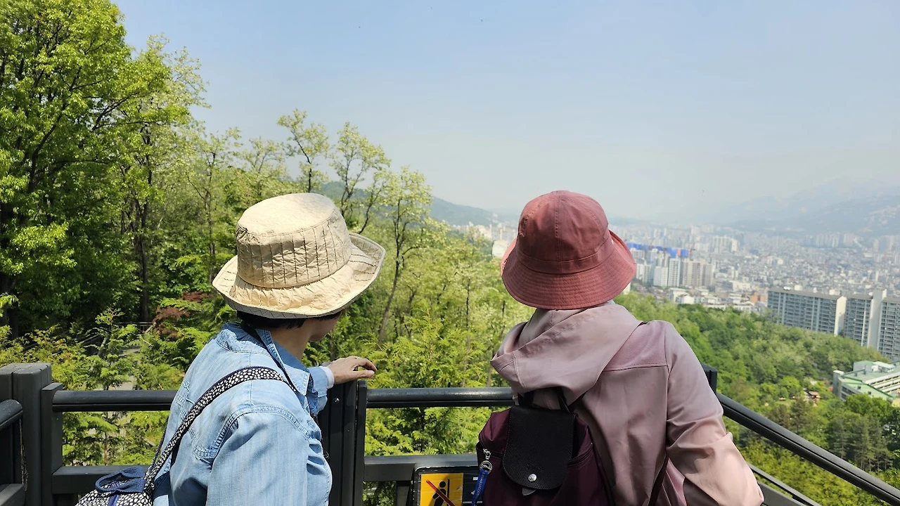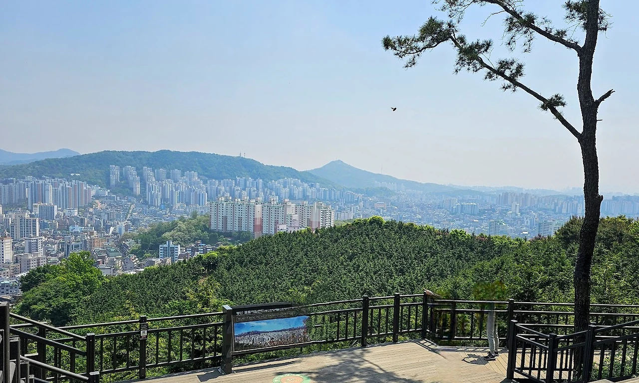 편백정에서 간식과 음료를 먹고 마시며 한숨 돌리고 다시 편백숲 전망대를 향하여 걷는다. 전망대에서 보는 경치가 과연 기가 막히다. 북한산에서부터 인왕산, 백련산, 안산, 멀리 남산까지 파노라마를 이루며 시원하게 한눈에 다 보인다. 그 여러 산 아래 계곡에 빽빽이 들어찬 고층아파트의 숲이 가슴을 좀 답답하게 하지만 먼산의 능선들이 이루는 곡선은 언제 봐도 아름답다.