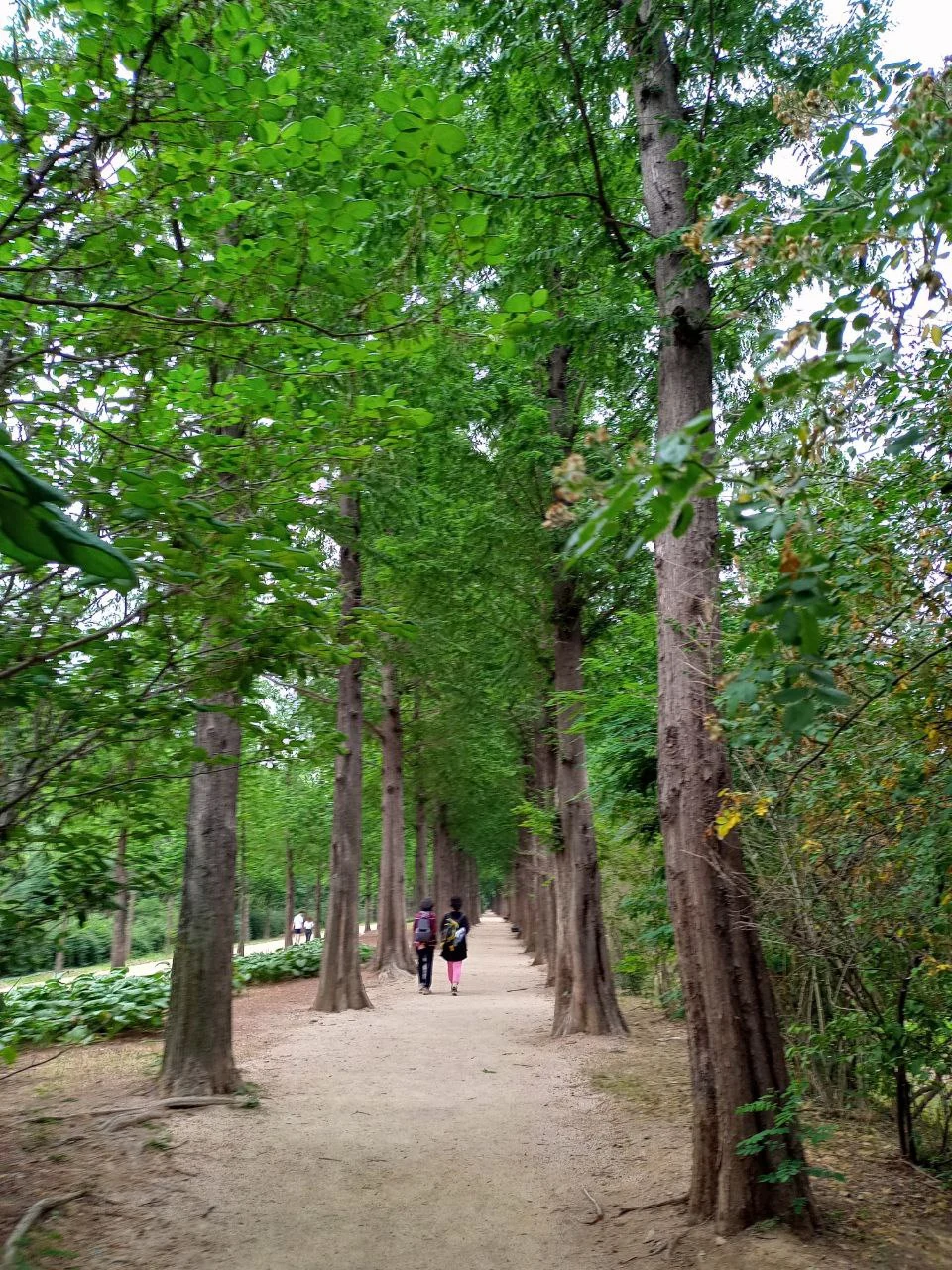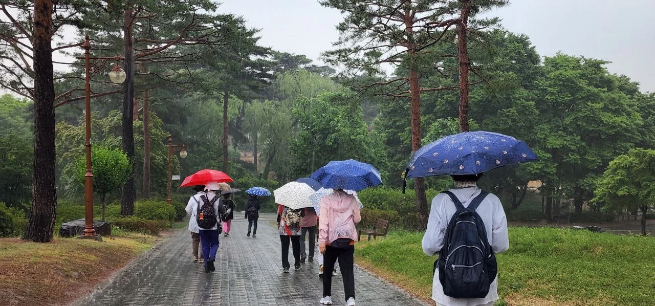 오늘은 한강변 쪽으로 가다가 다시 왼편에 보이는 하늘공원 자락길로 가려고 한다. 이 길이 유명한 메타세쿼이아 숲길이다. 사진 찍는 사람들이 즐겨 찾는 서울의 명소란다. 죽죽 벋은 키 큰 메타세콰이아 나무들이 푸른 그늘을 드리워 매우 아름답다. 그러나 이 길에 들어서서 감탄하며 얼마 걷지 않았을 때 후두둑 빗방울이 떨어지기 시작하더니 금세 소나기로 변했다. 때때로 비가 온다던 일기예보가 그대로 맞았다. 그래도 비를 좋아하는 친구들은 운치 있다면서 좋아한다.
