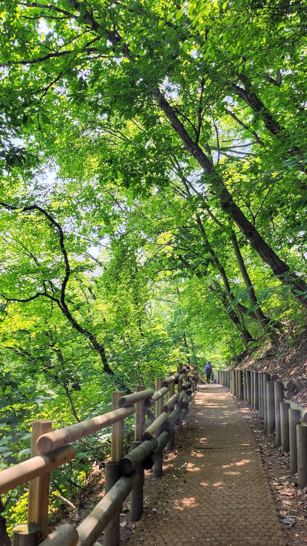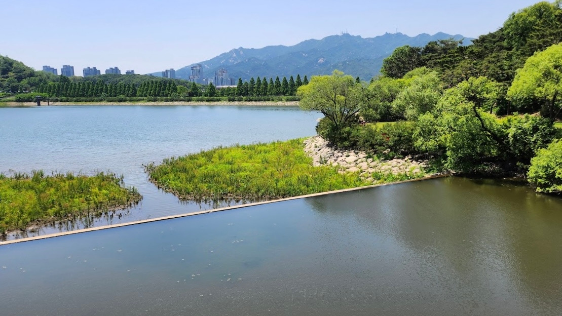 오늘은 3번 출구에서 출발하여 대공원 호수의 오른편으로 간다. 호수에서 동물원 입구로 가려면 다리를 건너야 하는데 다리를 건너기 전에 오른쪽에 숲길로 오르는 나무 계단이 있다. 이 길은 우리가 대공원에 오면 즐겨 찾는 호숫가 전망 좋은 숲길이다. 울창한 숲 속에 약간의 오르막 내리막도 있는 운치 있는 오솔길이다. 오솔길을 내려가면 물가 평평한 곳에 벤치도 여러 개 있다. 조용한 때 오면 호수를 보며 사색하거나 서너 명이 오붓이 앉아 담소할 수도 있겠으나 지금은 벤치에 사람들이 모두 앉아 있어 빈자리가 없다.