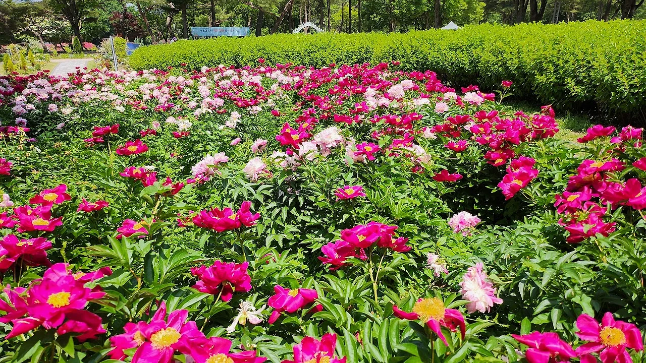 시내의 작약은 이미 모두 졌지만 이곳은 청계산기슭이라 기온이 좀 낮은지 다행히 아직도 싱싱하게 피어 있는 꽃이 많이 남아서 내년까지 기다리지 않고도 올봄의 작약을 실컷 볼 수 있다고 친구들은 만족한다. 장미원 입구에서 들어가면 작약 밭은 오른쪽으로 치우쳐 있어서 정면에 보이는 장미 밭으로 곧장 들어가서 장미에만 집중한다면 작약을 놓치기 십상이다. 벚꽃이 지고 난 후 모란과 작약도 개화기에 맞추어 좀 더 일찍 알려진다면 꽃을 찾는 관람객들의 관심을 더 모을 수 있을 텐데..