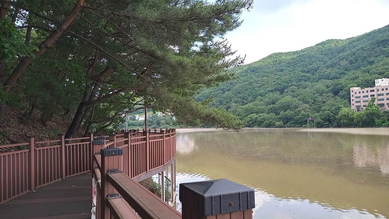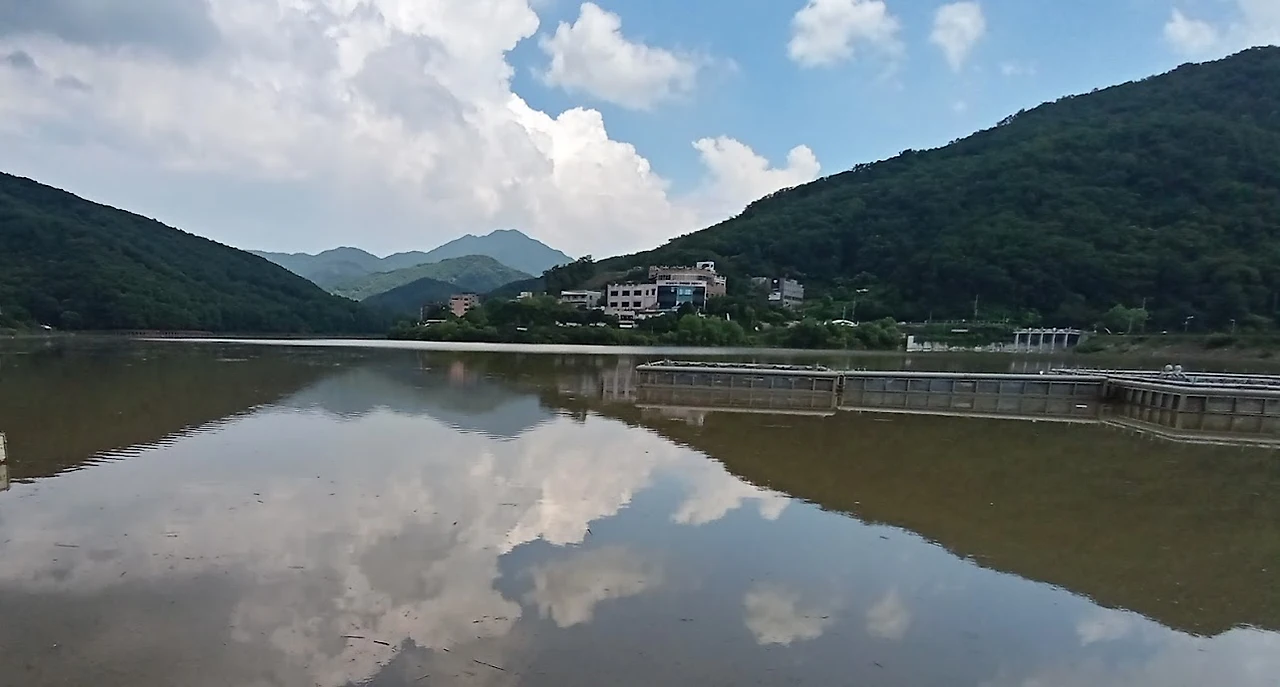 점심 후 동네 옆길로 계곡을 향해 계속 올라가니 저 위에 제방이 보이고 그 위에 호수가 있단다. 제방 끝에 올라서니 길게 펼쳐진 넓은 호수물 위에 먼산과 흰 뭉게구름이 비쳐서 뜻밖의 아름다운 풍경이 나타난다. 먼산은 천마산일까? 이 호수는 원래 농업용수를 위한 저수지였다고 한다. 지금은 저수지 둘레에 데크길을 만들고 산책로도 만들어서 아주 걷기 좋은 길이 되었다. 호수 둘레길만 걷는데 한 시간 정도 걸릴 것 같다.
