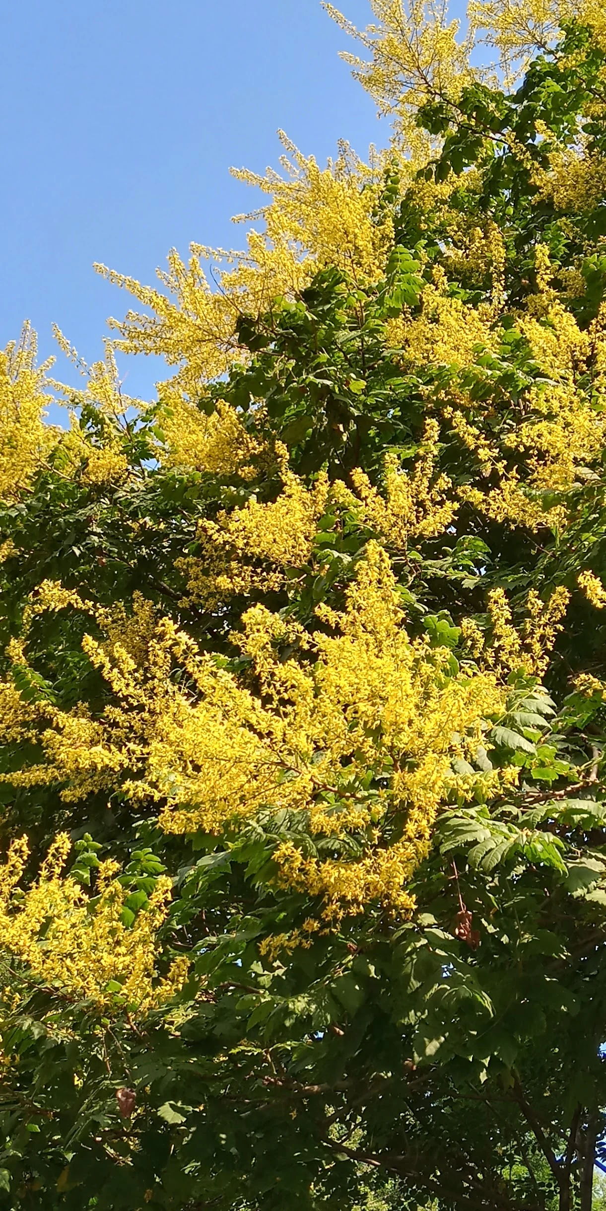 우리가 모감주꽃나무를 알게 된 것은 얼마 되지 않는다. 4 년 전 여름인가 7월 첫 주에 우리 모임에서는 노을공원을 향해 걷다가 북쪽 입구에서 우연히 샛노란 꽃이 가득 핀 높은 나무들과 꽃길을 만나 신기해서 멈춰 서서 쳐다보고 있었다. 그때 지나가던 어떤 행인이 이 나무가 모감주꽃나무라고 꽃이름을 알려주며 이 꽃이 지고 나면 가을에는 새까만 열매가 열리는데 이 열매가 단단해서 절에서는 이것으로 염주를 만들어서 이 나무를 일명 염주나무라고도 한다는 설명까지 덧붙였다.