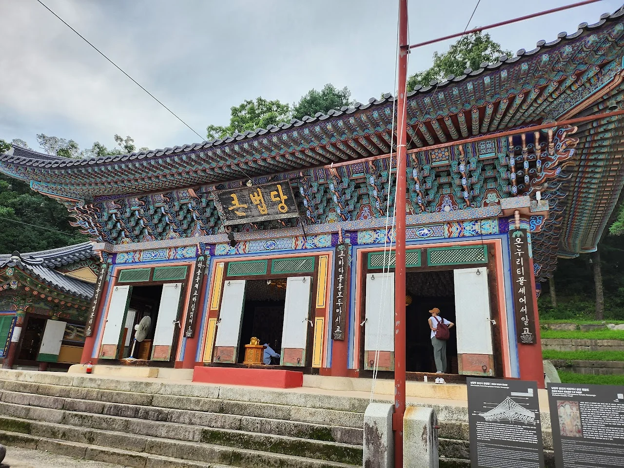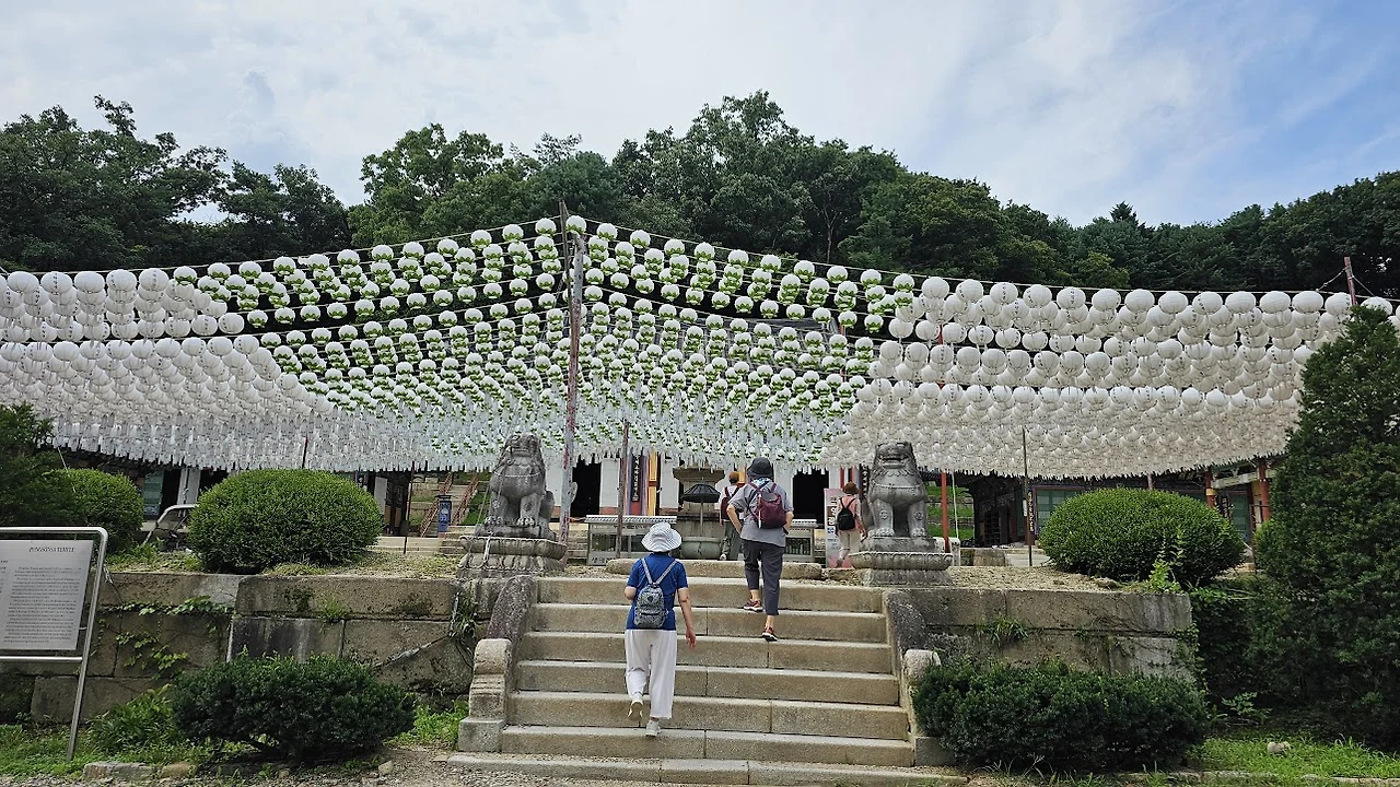 이제 연밭을 돌아보고 대웅전쪽으로 간다. 찾아본 바에 의하면 봉선사에서 특별한 점이 있는데 그것은 바로 보통 볼 수 있는 대웅전이라는 한자어 대신 큰 법당이라고 한글로 쓴 현판이라는 것이었다. 과연 큰 법당뿐만 아니라 현판 아래 기둥들에 세로로 적힌 주련도 모두 한글이다. 그러지 않아도 불경에서 인용되는 문구는 온통 한자로 되어 있어 이해하기 어려웠는데 한글로 보니 반갑다. 그리고 또 한 가지 이색적인 광경은 오늘 큰 법당의 앞마당을 가득 채운 흰색 연등이다. 석가탄신일 전후에 절에 가면 화려한 색깔의 연등을 볼 수는 있었지만 백색 연등은 오늘이 처음이다. 나중에 알고 보니 백색 연등은 백중날(음력 7월 15일) 기념행사를 위한 연등이었다. 백중날은 먼저 떠난 조상과 스님들의 극락왕생을 빌기 위해 제사를 드리는 날이라고 한다.