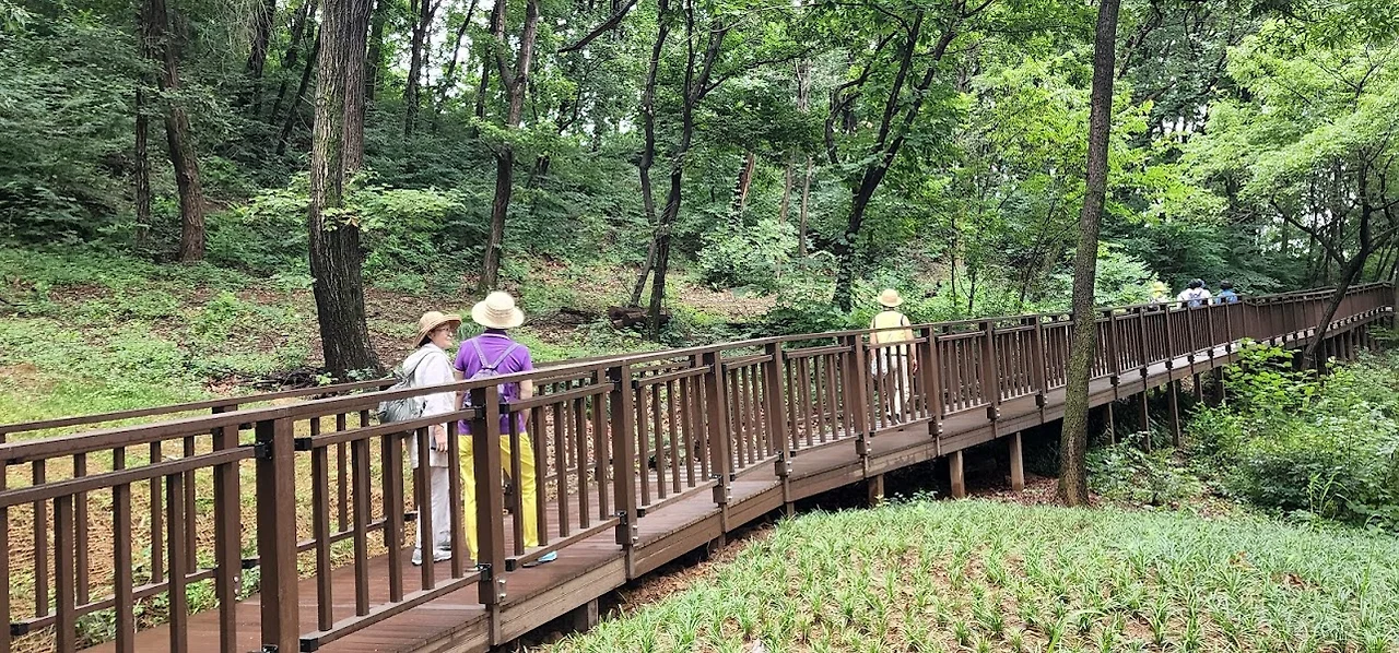 숲길로 올라가 걸어 보려 했으나 무장애숲길 데크가 비 온 다음이라 미끄러워 위험할 것 같아 도중에 내려와 편한 길을 택한다. 그러나 전망대가 다른 편에 있어 그곳까지는 가보기로 했다.