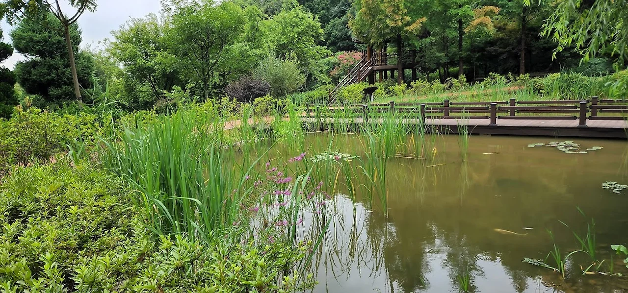 식물원과 생태박물관은 실내공간이라 다음에 들어가 보기로 하고 오늘은 야외수목원을 먼저 돌아보기로 한다. 자그마한 연못들과 잔디마당과 화초원과 농경문화전시관을 지나니 시원한 폭포가 나온다. 폭포 옆쪽으로는 숲길 입구가 보인다.