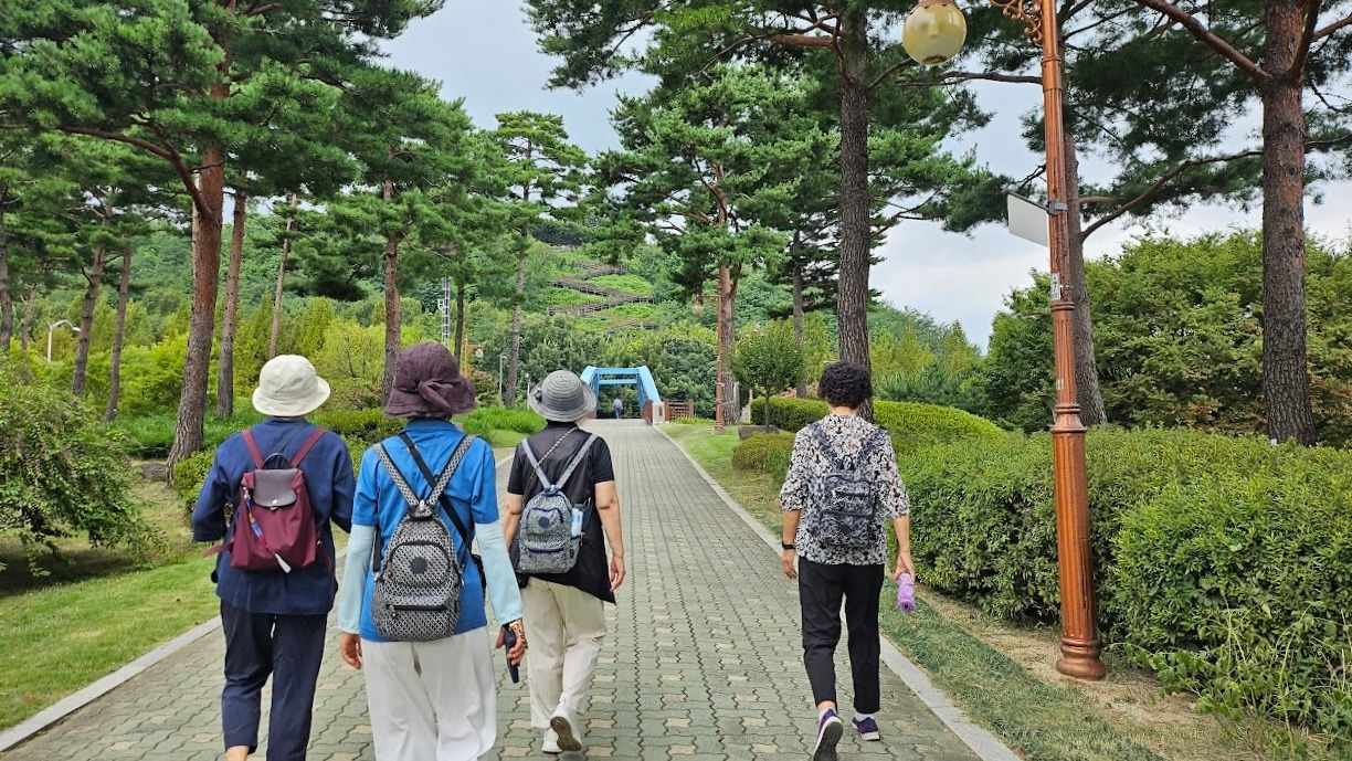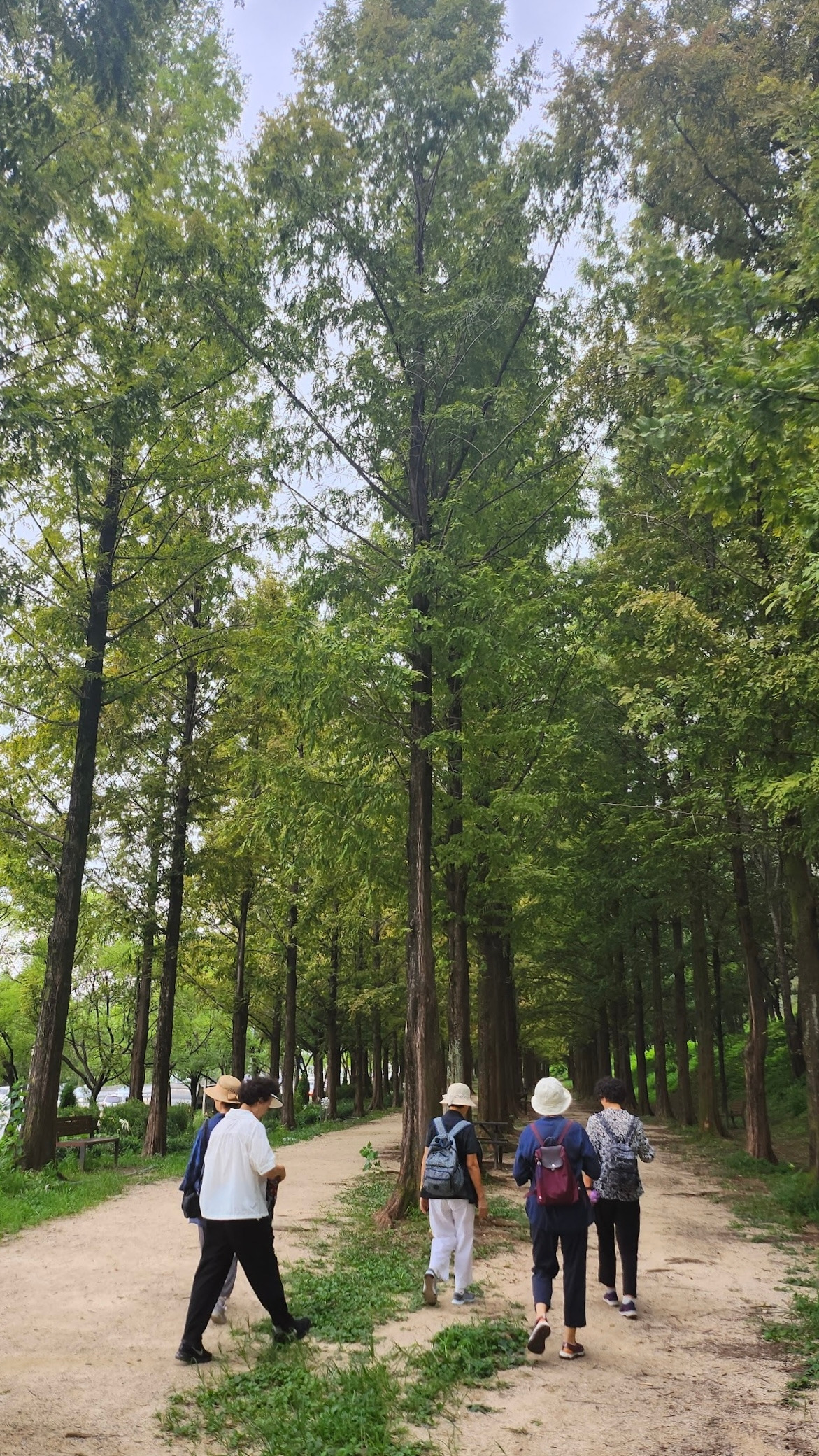 난지천 공원은 하늘공원과 상암동 매봉산 사이를 흐르는 작은 개천 난지천 주변에 조성된 공원으로 월드컵공원의 하나다. 이 공원 자체도 숲길과 잔디밭이 넉넉하여 이 안에서만 걸어도 충분히 하루를 즐길 수 있는 넓이와 규모이다. 오늘 우리는 하늘공원과 난지천 공원을 각각 반 바퀴씩 걸은 셈이다. 난지천 공원은 평탄해서 천천히 여유 있게 걸으면서 비에 젖은 푸른 숲과 잔디를 감상하며 낭만을 즐길 수도 있겠지만, 비는 오는데 우산이 없는 친구도 있으니 식당을 찾아가는 발걸음은 여유가 없이 자연히 빨라질 수밖에 없다. 비를 맞아 옷이 너무 젖으면 감기 들까 걱정되니까.