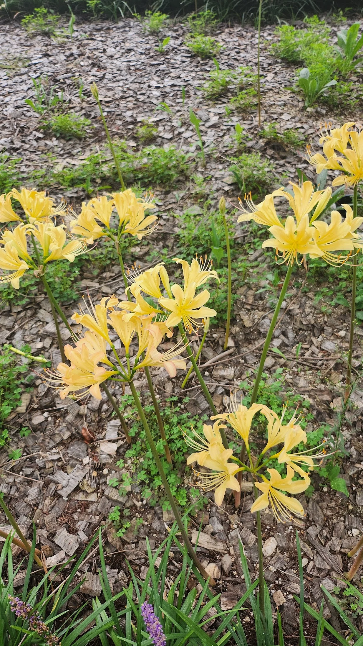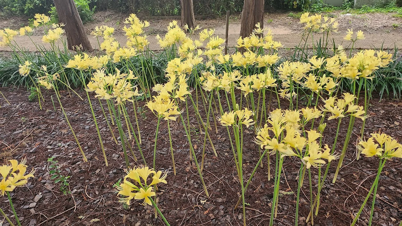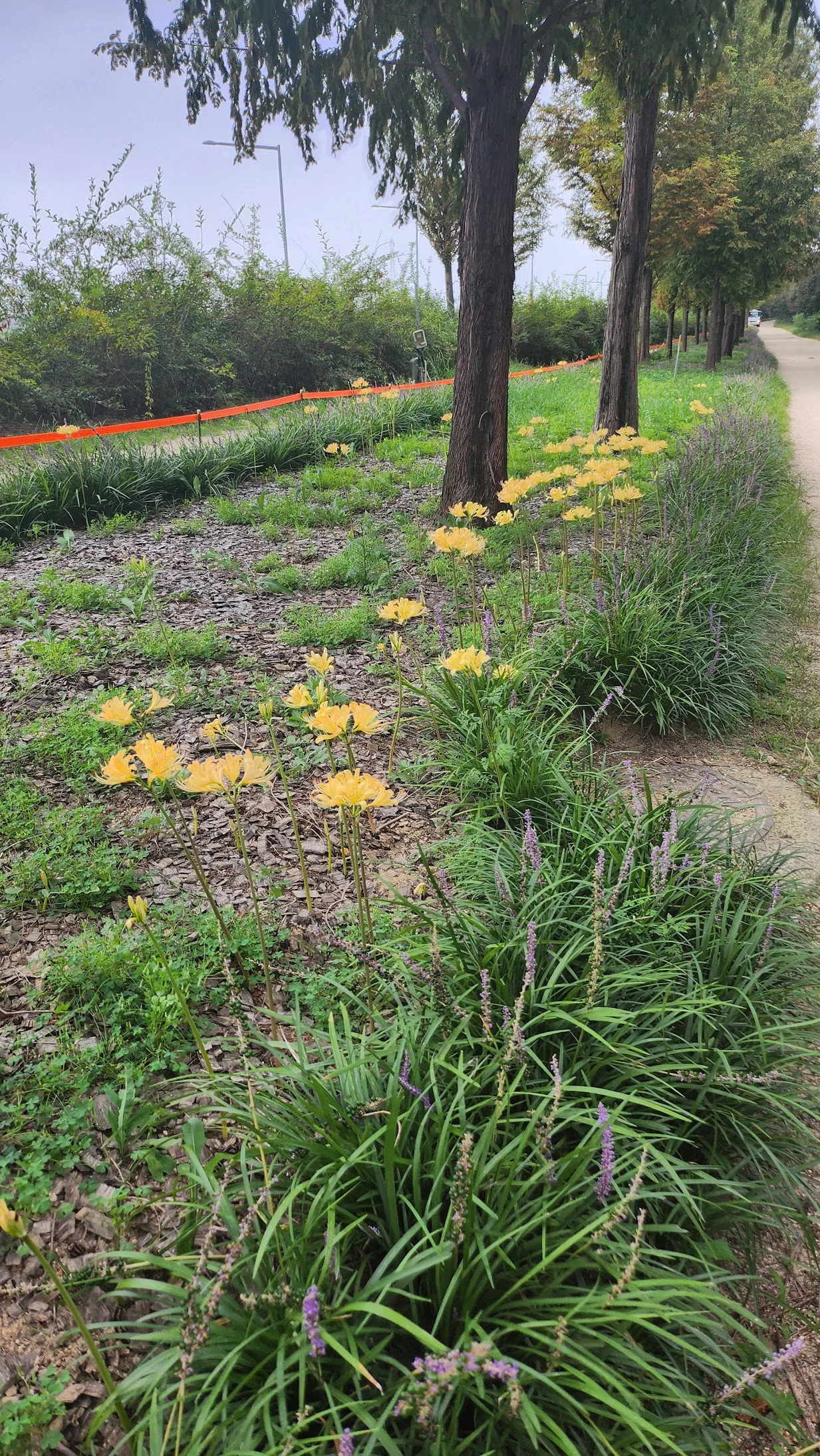 활짝 핀 상사화를 기대하며 길이 비교적 한산하여 길게 벋은 가로수길을 여유 있게 걸을 수 있겠다고 좋아하려는 순간 빗방울이 떨어지기 시작한다. 비 예보가 있어서 오늘 걷는 사람이 적은가 보다. 기대하던 꽃도 한참 동안 보이지 않다가 노란 꽃무릇이 드문드문 두 세 송이씩 솟아 올라와 있다. 이제 막 피기 시작하는 것 같다. 우리가 또 너무 서둘러 일찍 왔나 보다. 그런데 이제까지 붉은색 꽃무릇만 많이 보았지 노란색 꽃은 처음이어서 새롭기만 하다. 우리야 막 피기 시작한 몇 송이 안 되는 꽃무릇을 보고도 좋아하며 지나가지만 내일 시작한다는 상사화 축제를 생각하면 좀 안타깝다. 꽃도 덜 피었는데 비까지 오면 안 되는데, 하며 준비하는 담당자들이 노심초사할 것까지 대신 걱정하면서 비 내리는 하늘공원로를 따라 북쪽의 난지천공원을 향해 터벅터벅 걸어간다. 일기예보를 못 보고 우산을 안 가져온 친구들이 있어서 잠깐이라도 비를 피해 갈 수 있는 곳이 있으면 좋을 텐데 난지천 공원에 이를 때까지는 큰길이어서 도중에는 아무것도 없다. 난지천 공원에 도착하니 비로소 정자 하나가 나타나서 이곳에서 잠시 쉬며 간식 시간을 갖는다.