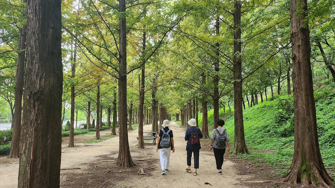 일단 경기장 남문 쪽으로 올라가서 월드컵로를 가로지르는 경기장 앞 넓은 육교를 건너서 평화의 광장을 향해 걷는다. 평화의 광장에 서면 오른편에 동산 같은 하늘공원이 서있고 그리로 오르는 계단도 보이지만 오늘 우리는 공원 위로 하늘을 보러 올라가지 않고 하늘공원 아랫 자락으로 걸을 것이다. 입구 쪽으로 가는 구름다리를 건너면 왼편으로 “메타세쿼이아 길”이라고 이정표가 나타난다. 얼마 전까지만 해도 이 길을 “희망의 숲길”이라고 불렀는데 언제부터 길 이름이 바뀌었는지 모르겠다. 우리는 처음에 그 이름이 좋아서 이 길을 찾아왔는데 말이다.