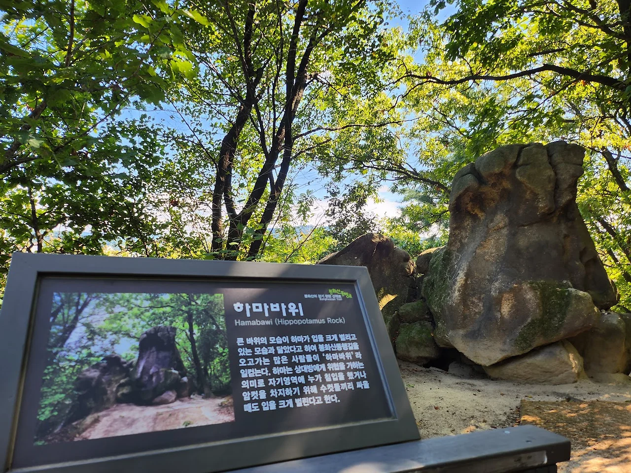 봉화산 정상에서 잠시 쉬는 시간을 갖고 하산한다. 내려갈 때는 올라오던 길과는 반대로 산허리를 돌아 중랑구청 쪽으로 좀 내려가다가 봉화산역으로 다시 간다. 내려가는 길 옆에 하마바위라는 표지석이 서 있어 바위를 찾아보니 옆에 풀숲 사이에 하마 비슷하게 생긴 바위 하나가 서 있다. 봉화산에는 바위도 많고 내려가는 돌길에 왕모래도 많이 덮여 있다. 데크길과 흙길이 끝나는 곳에 이르니 수변공원이라는 근린공원이 있고 신내 9 단지의 대규모 아파트단지가 보인다. 여기서부터는 봉화산과 아파트단지 사이에 난 큰길을 따라서 신내공원을 지나 봉화산역을 찾아간다.