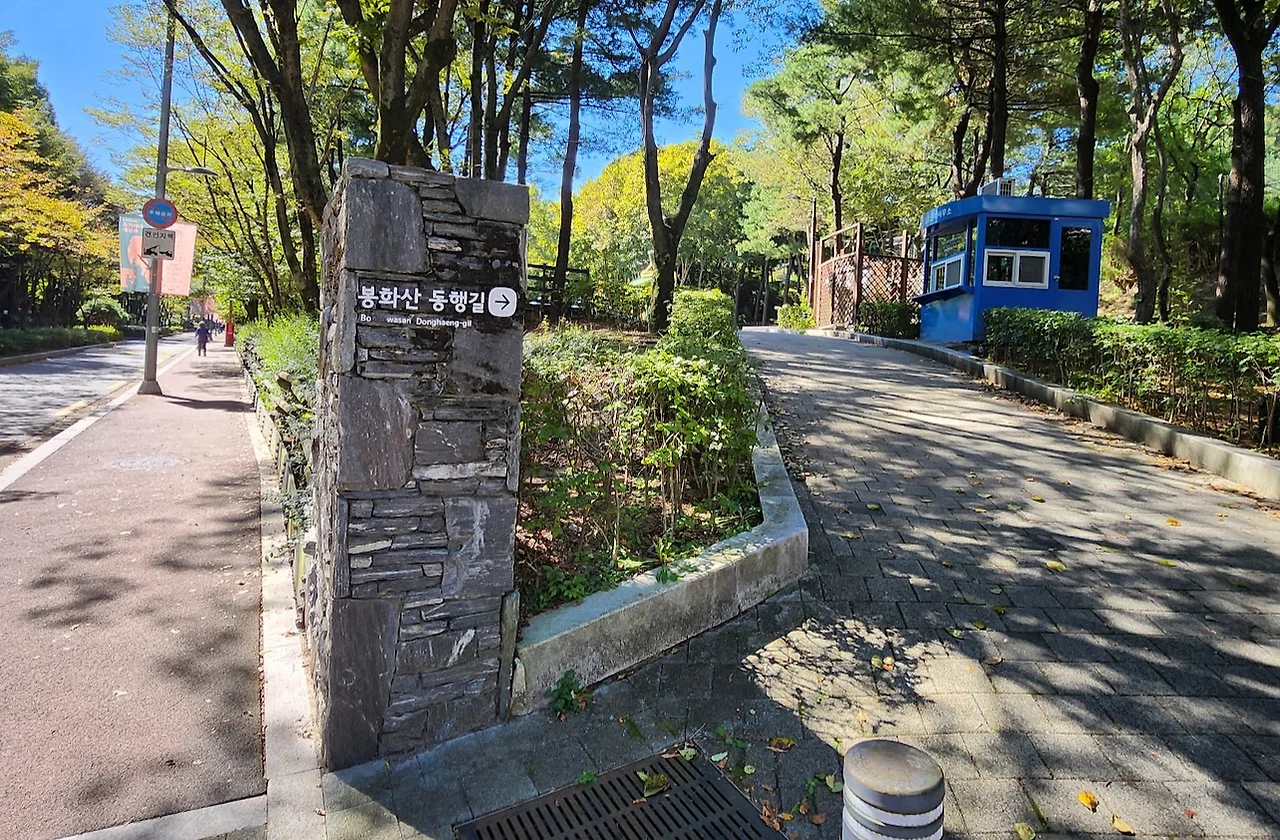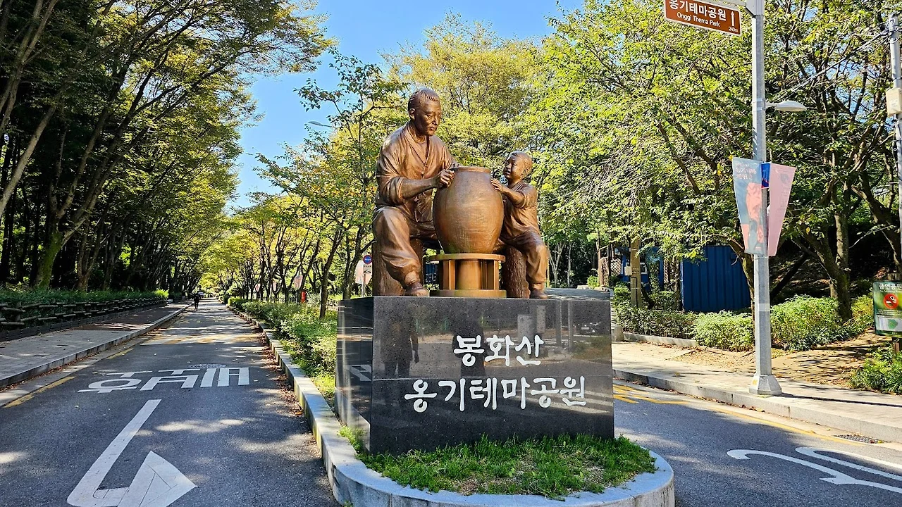 어쨌든 지하철역에서 나와 산이 보이는 방향으로 곧장 가니 왼쪽으로는 신내공원이 나오고, 오른쪽으로는 봉화산 옹기테마공원이라는 표지판과 함께 옹기 빚는 도공을 형상화한 조형물이 보인다. 옹기테마공원으로 들어서자 곧 봉화산 동행길의 안내판이 나타난다. 여기서는 무장애숲길이 동행길이라는 이름을 얻었구나 생각하며 그 길로 들어선다.