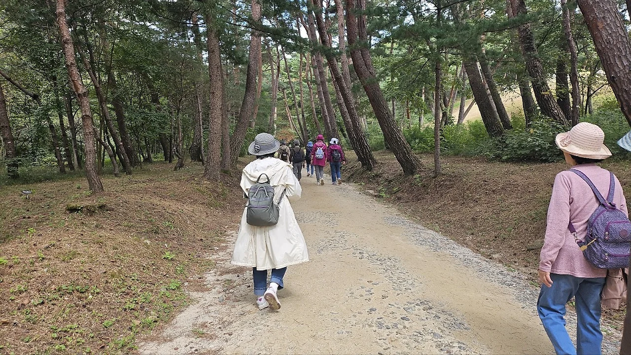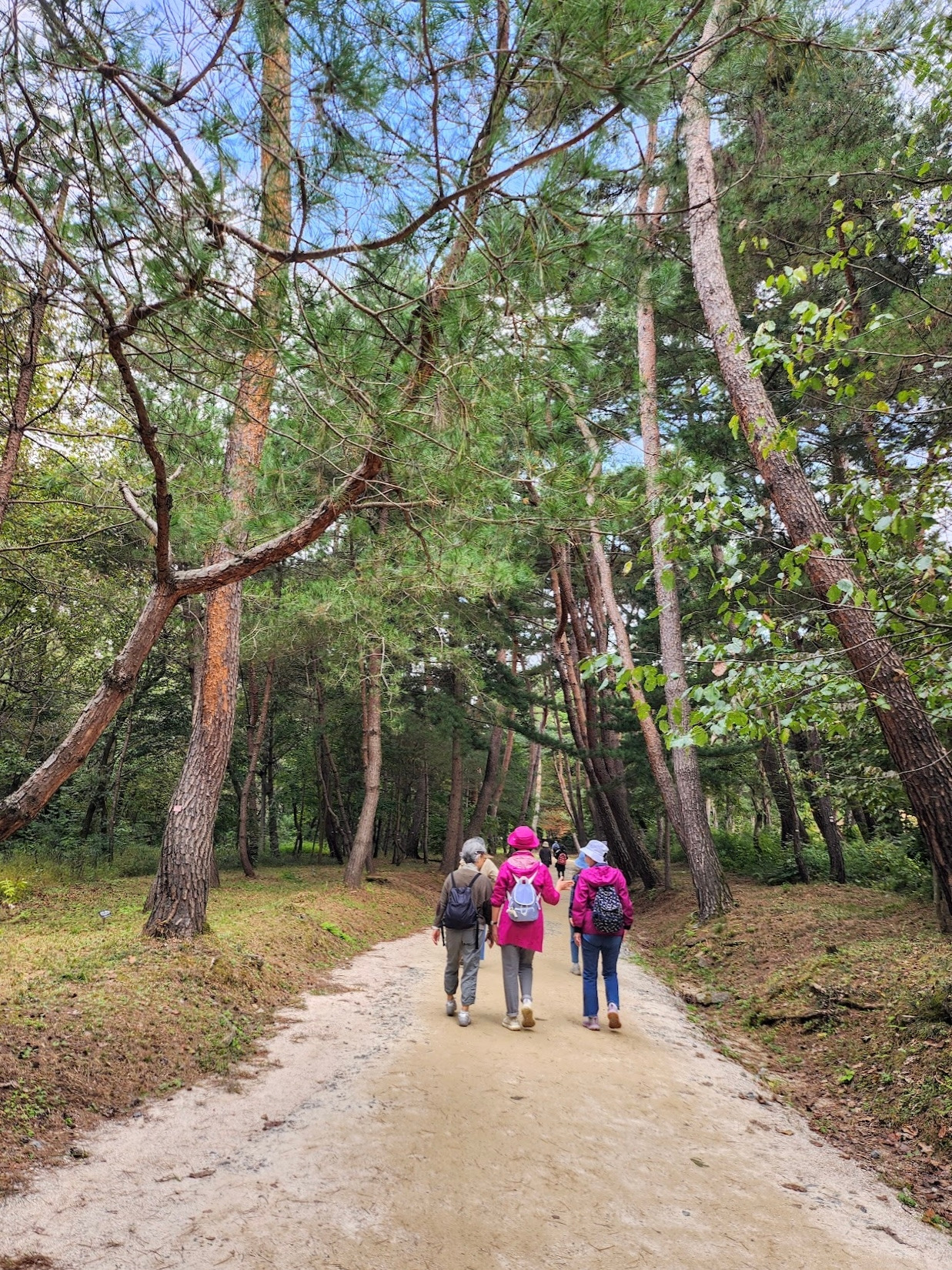 울창한 숲길에 들어서니 감탄사가 절로 나온다. 600년 이상 보존되고 훼손이 적어 오래된 소나무 고목들이 빽빽이 늘어서 있다. 숲 사이로 올려다 보이는 맑은 하늘에 흰 구름도 아름답다. 이 숲길은 오르막 내리막길이 적당히 계속되어 등산하는 기분도 난다.