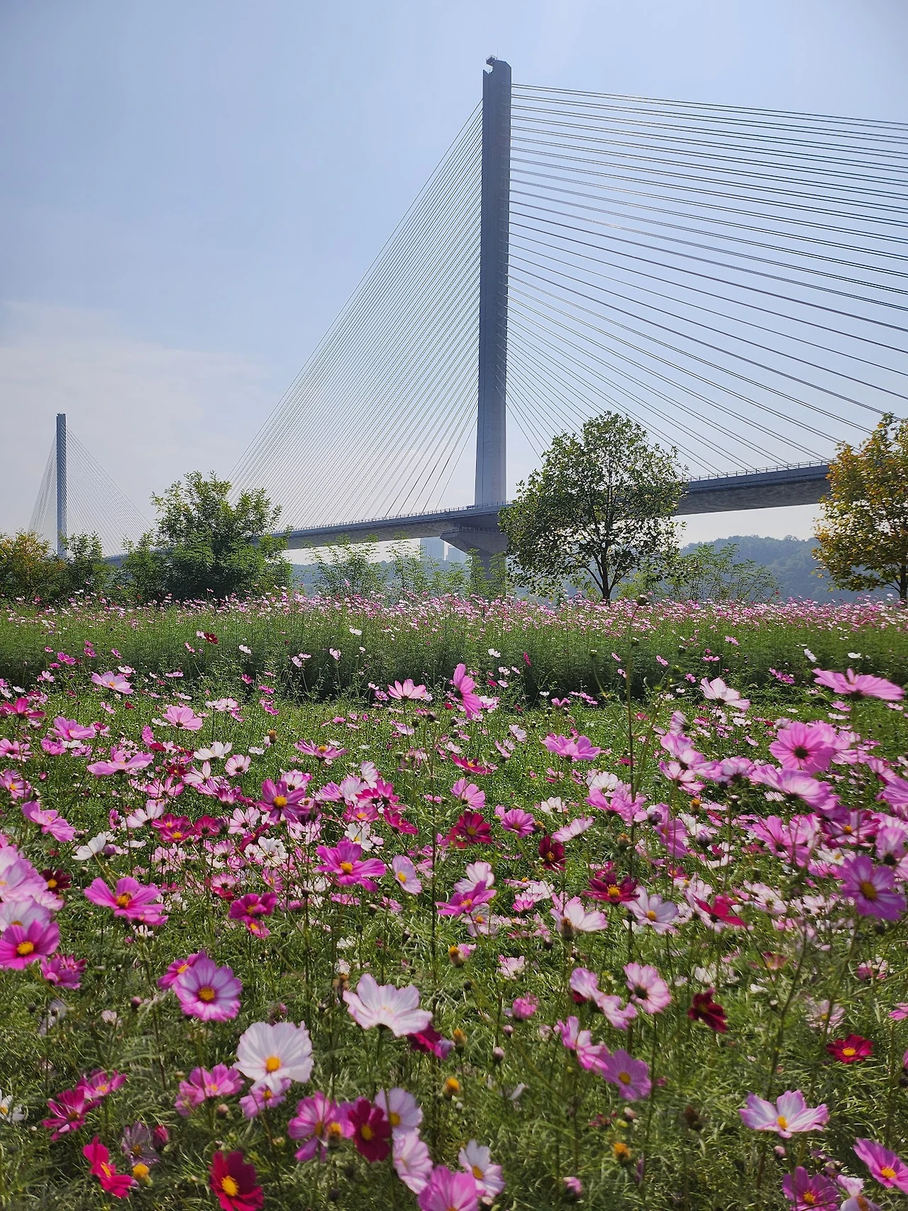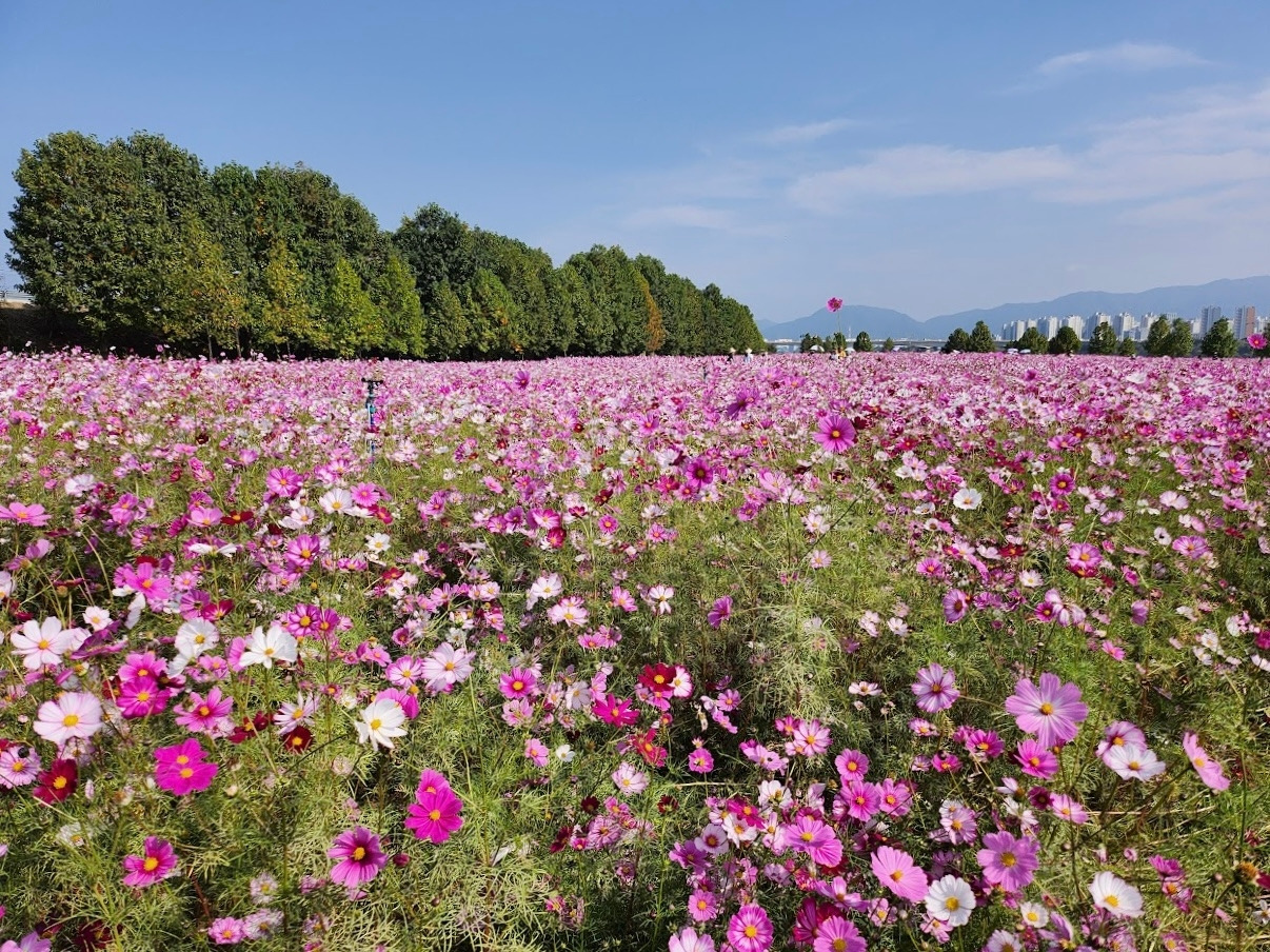 코스모스 단지는 예전보다 훨씬 더 동쪽으로 멀어져 있어서 주차장에서부터 새로 개통되는 구리고덕대교를 향해 1 km 정도 걸어야 한다. 가족캠핑장을 지나고 한창 공사 중인 대교진입로 아래를 지나 강변을 따라가니 비로소 드넓은 코스모스꽃 벌판이 펼쳐진다. 오래간만에 환한 분홍색 코스모스 꽃밭에 들어서니 그 황홀함에 모두에게서 탄성만 나올 뿐이다. 어수선한 공사장 옆길을 참을성 있게 걸어온 보람이 있었다. 다만 넓은 꽃밭에서 코스모스를 실컷 즐기면서 산책은 할 수 있으나 쉬어 가면서 감상할 수 있는 쉼터는 보이지 않는다.