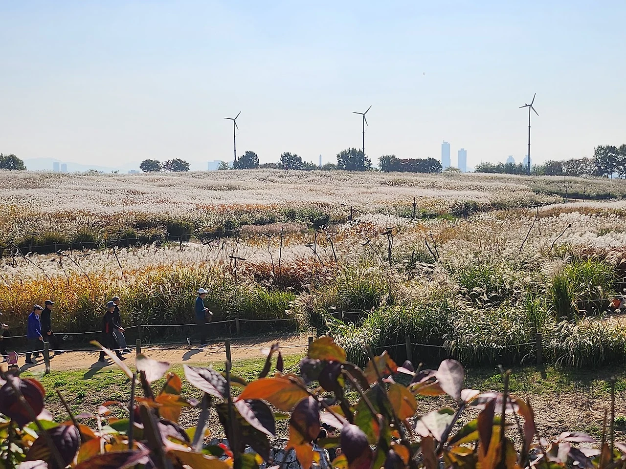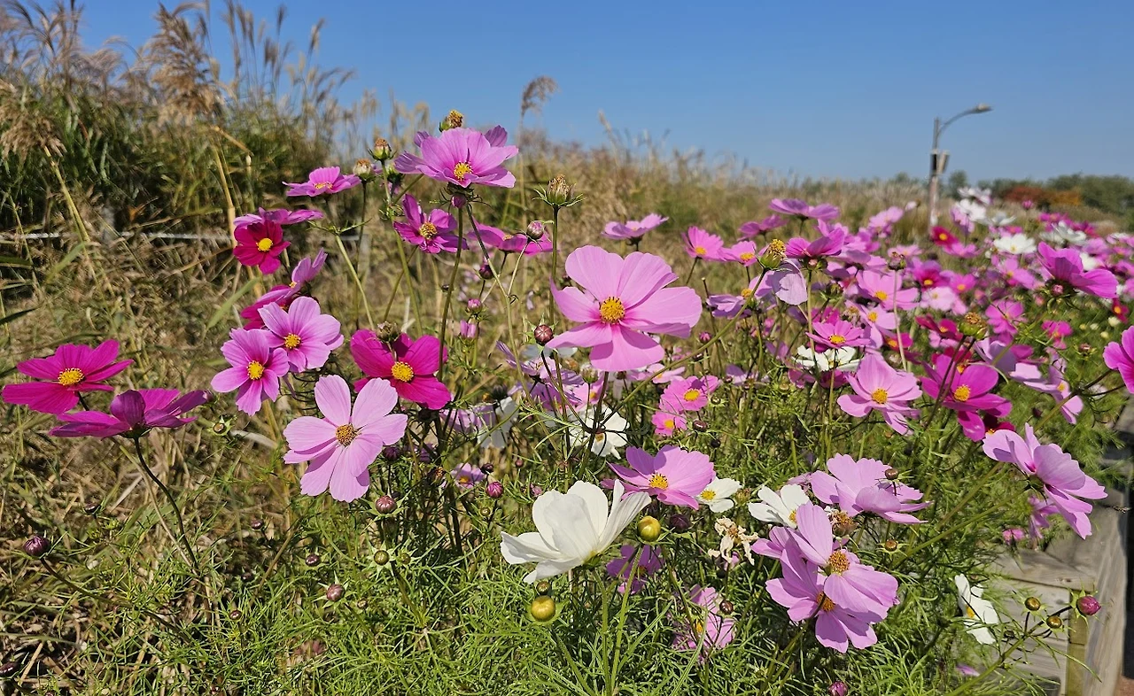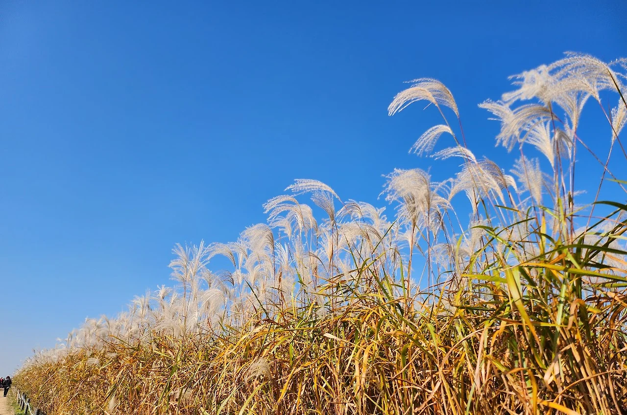 완만한 오르막길을 이삼십 분 정도 숨차게 올라가면 하늘공원이라고 새겨진 표지석이 우리를 맞이한다. 표지석 뒤로 드넓은 억새 벌판이 펼쳐진다. 억새밭 초입에는 정자도 한 채 있는데 정자 주변에는 댑싸리밭이 있어 은색 벌판에 연붉은 색을 가미해 준다. 몇 년 전에는 이곳의 코스모스 밭이 황홀했던 기억이 난다.