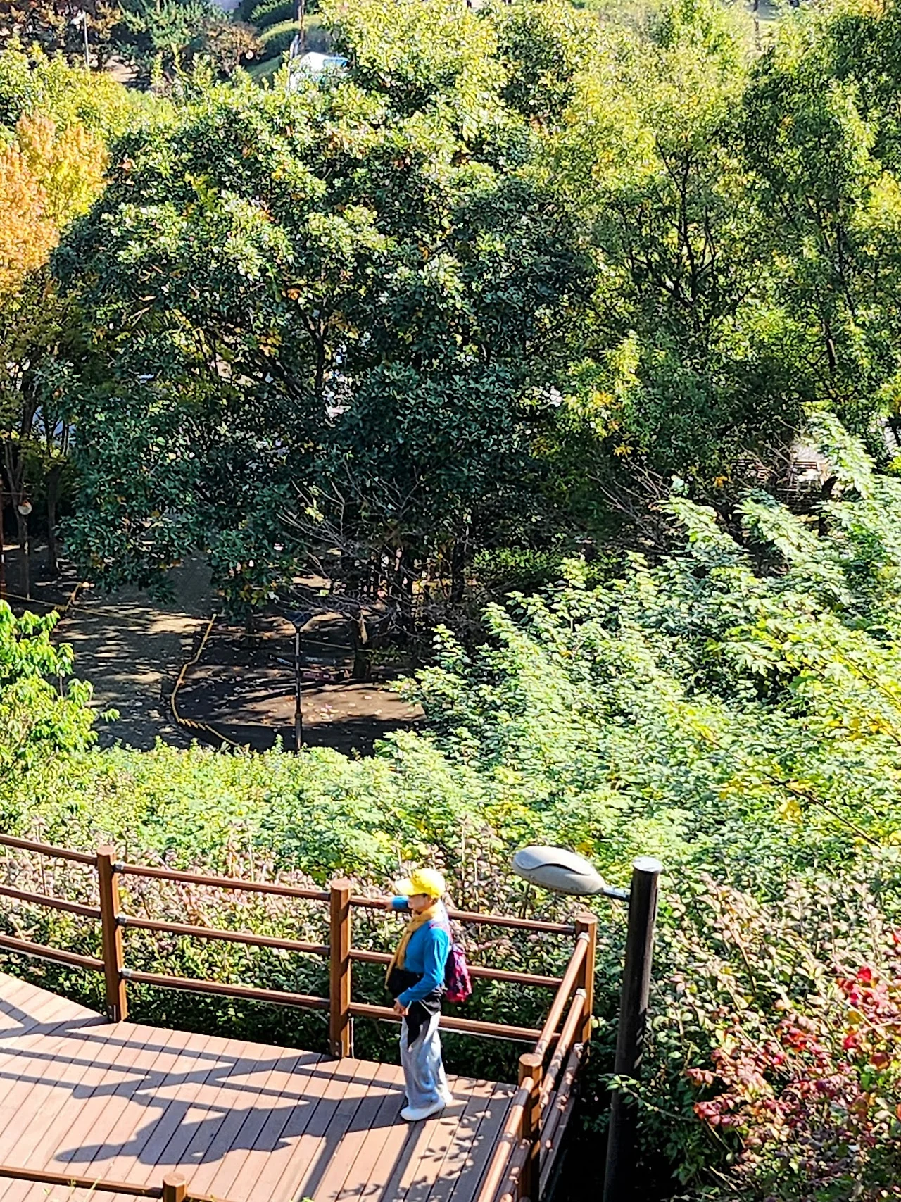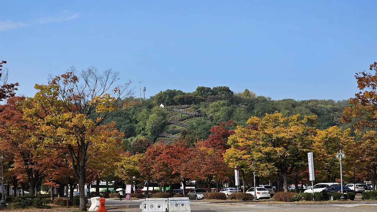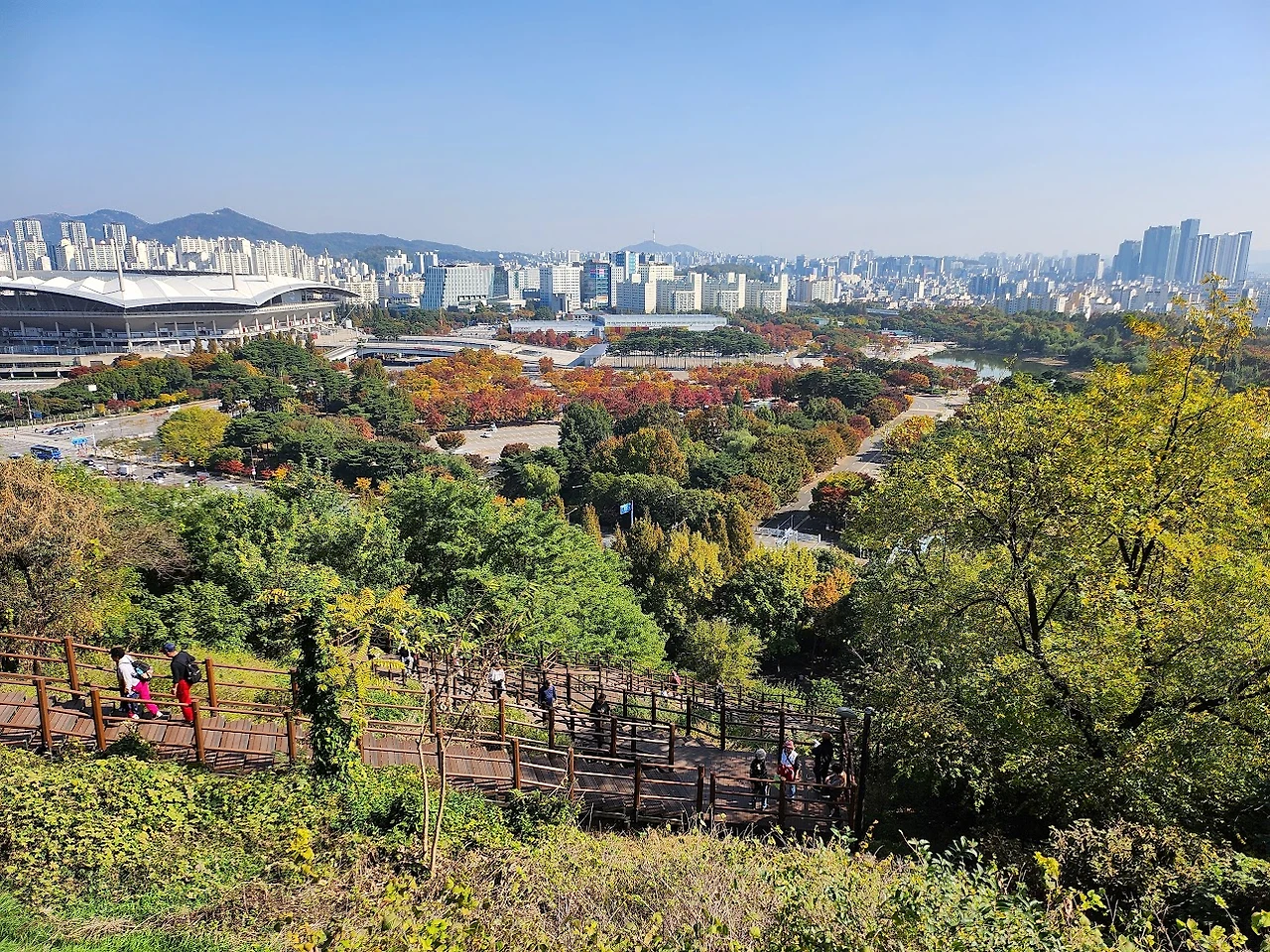 억새야 내년에 보자! 하고 작별인사를 하고 내려가려는데 갈림길에서 몇 친구들이 하늘계단으로 내려가보겠다고 한다. 평소에 계단을 회피하던 친구들이었는데 오늘은 웬일이지 하면서 하늘계단을 내려가는데 내려가면서 보는 경치가 또 기가 막히다. 월드컵경기장과 이제 막 단풍이 들기 시작한 평화공원의 숲이 어우러져 아름답다.