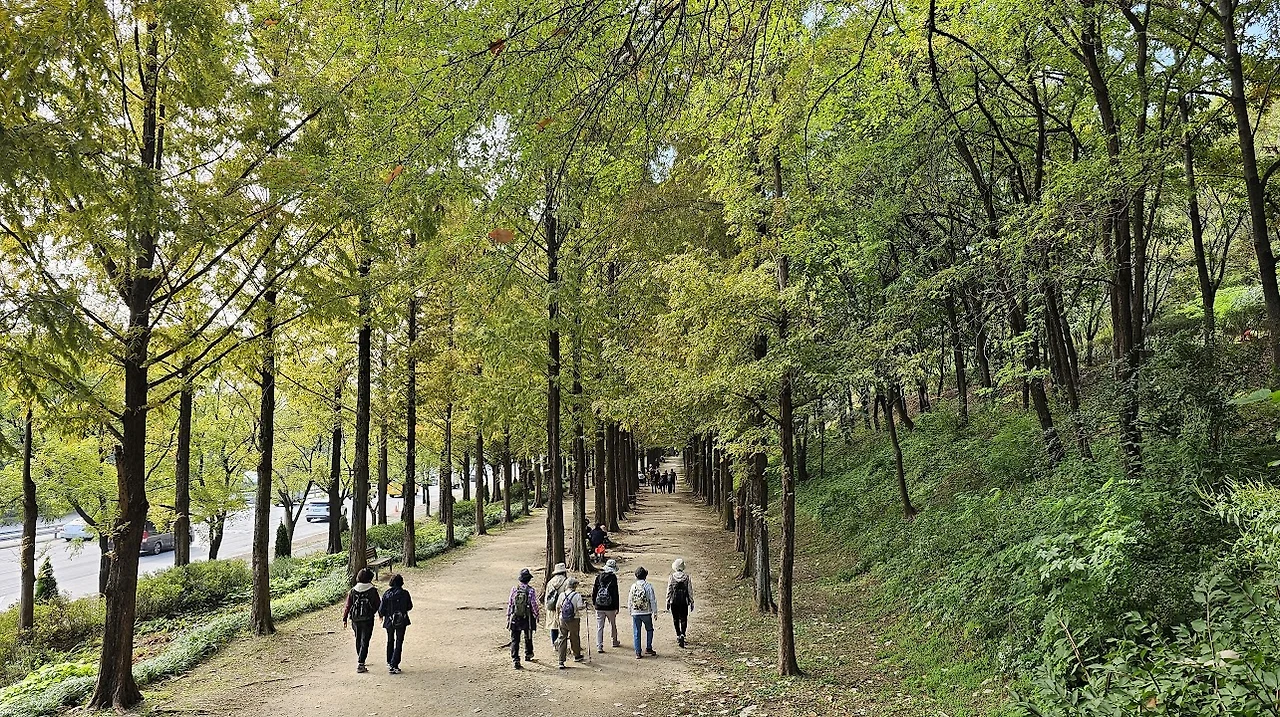 우리는 하늘공원으로 곧장 올라가는 계단이 아니라 우회로를 택하여 계단 입구 직전에서 왼편으로 난 메타세쿼이아 숲길로 들어선다. 이 길은 우리가 좋아해서 자주 오는 길이다. 메타세쿼이아 나뭇잎은 아직도 푸른색이지만 머지않아 그 잎이 적갈색으로 물들겠지?