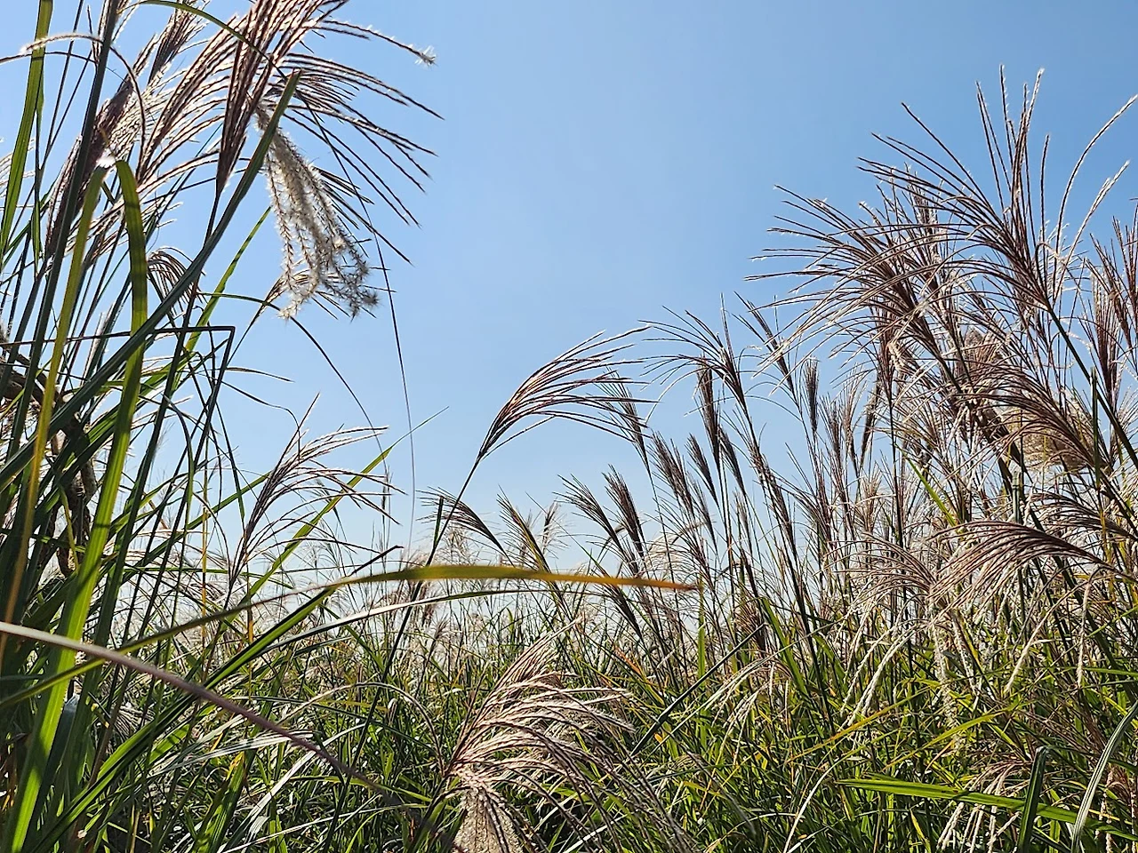사람의 키보다 훨씬 큰 억새가 우거진 샛길로 들어가서 하얗게 부푼 억새꽃 사이로 하늘을 올려다보니 높고 맑은 하늘이 정말 아름답다. 늘 머릿속에 그리며 담고 있는 구름 한 점 없이 맑고 파란 전형적인 가을하늘이다.