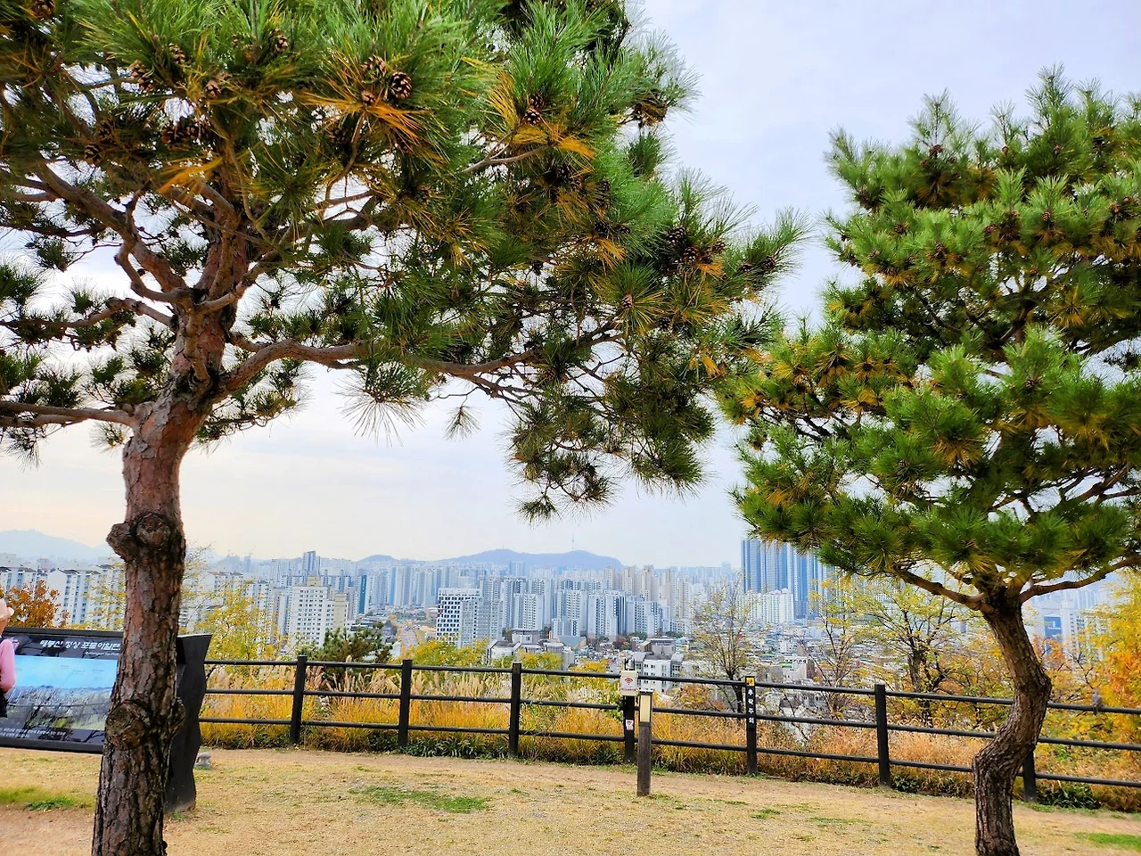 정상(108 미터)에 오르니 앞이 확 트인 광장이다. 동쪽의 용마산부터 롯데타워 그리고 남산의 서울타워까지 서울이 환히 내려다 보이는 그야말로 전망명소이다. 발굴 시기는 오래되지 않았지만 여기서 삼국시대의 고구려 유적으로 추측되는 보루도 발굴했다고 한다.