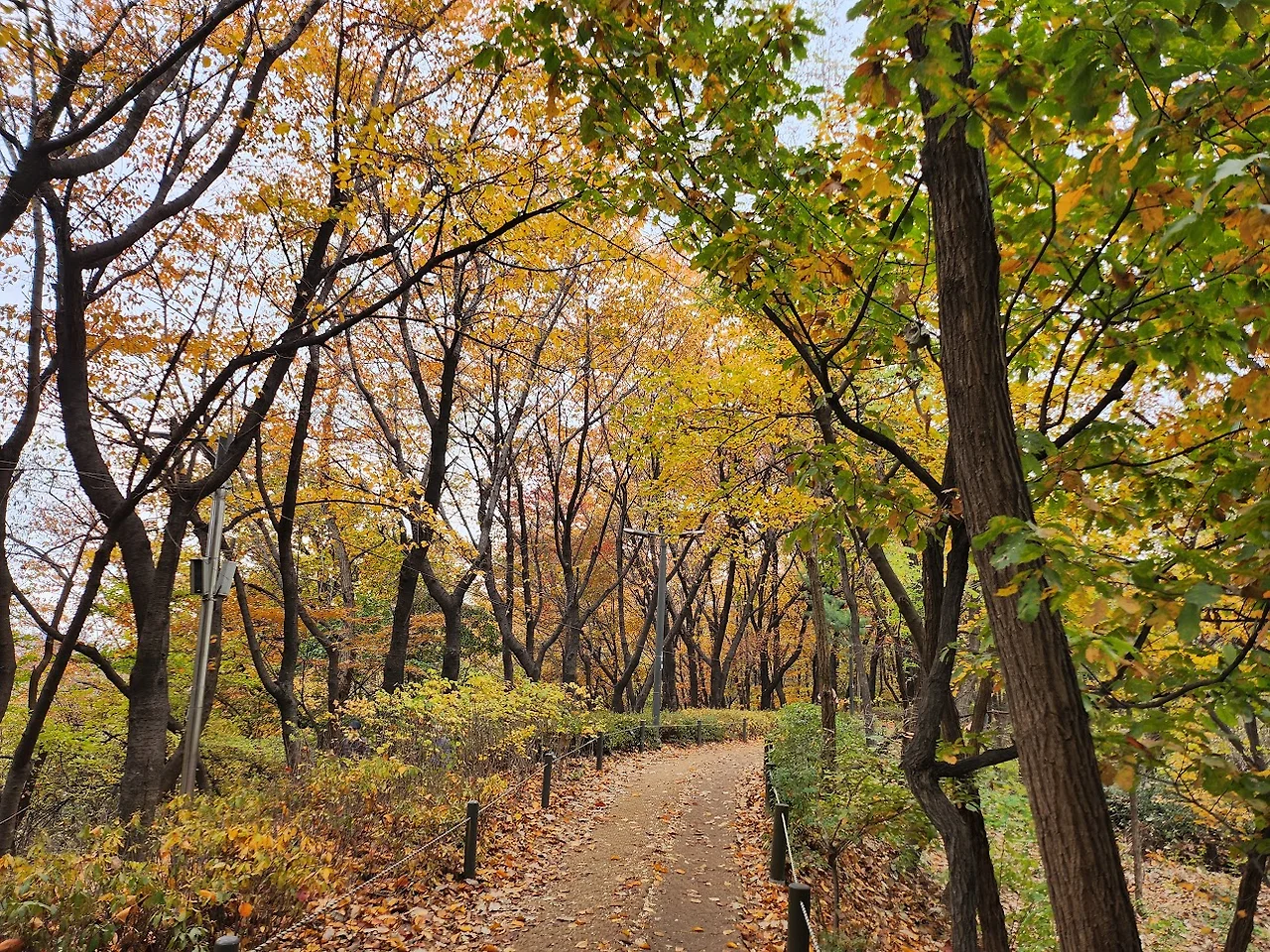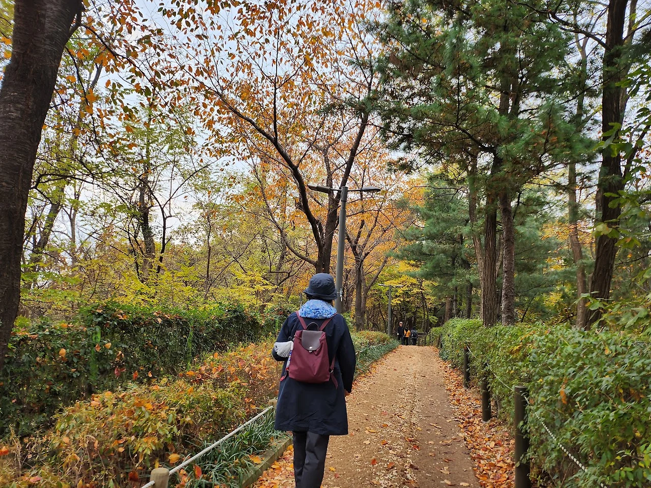 배봉산의 정상 해맞이 광장으로 오르는 완만한 능선길은 가을색이 깊어진 낭만적인 숲길이다. 낙엽이 깔린 등산길 옆에는 따로 황톳길도 만들어 놓아 맨발로 걷는 사람들도 자주 보인다.